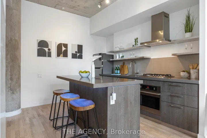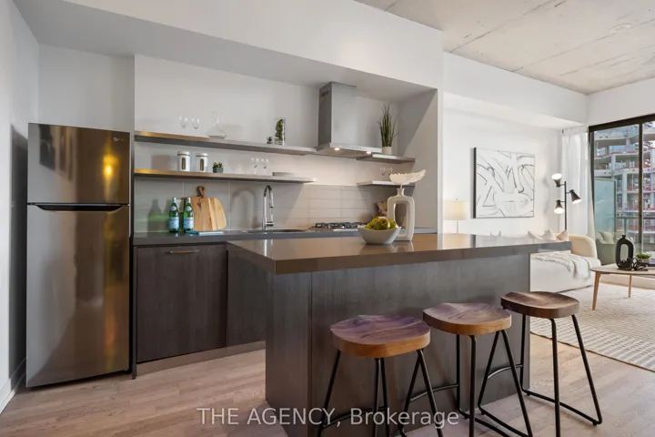 +"PublicRemarks": "Step into the epitome of King West luxury at Fashion House Condos! One of Downtown Toronto's most sought-after buildings, this boutique gem radiates sophistication from the entrance onward. Located atop 'The Keg Steakhouse' and 'Majesty's Pleasure' social beauty club, and across from the iconic 'Rodney's Oyster House' and 'Mademoiselle Raw Bar & Grill', this is Fashion District living at its finest-- surrounded by the vibrant nightlife and renowned culinary experiences of King West. Did you know 'Sir Elton John' owns the penthouse across the street? This south-facing unit is flooded with natural light and boasts forever-unobstructed views of the district and the CN Tower, visible from both the balcony and bedroom. Enjoy open-concept, loft-style, living with 10' exposed concrete ceilings and pillars, and floor-to-ceiling windows. Step out onto a cabana-style balcony overlooking the buildings signature infinity pool- perfect for poolside vibes from the comfort of your home. With a gas BBQ hookup, deck tiles, and a luxurious round daybed, your outdoor escape awaits. Inside, discover a modern, open-concept interior with a practical layout. The European-style chef's kitchen features open top shelving, high-end stainless-steel appliances, a gas cooktop, and a spacious waterfall island. The primary bedroom, fits a king bed, offers a large walk-in closet and stunning views. The spacious den comfortably fits a queen-size bed and includes built-in storage. Both the bedroom and the den come with privacy sliding doors. The rarely available 5-piece bathroom provides the luxury of both a shower stall and a bathtub. Top-notch amenities include an infinity pool and cabanas connected to a state-of-the-art gym and a party room. TTC at your doorstep, 5 minutes by bike to the Toronto Waterfront and Tiki Taxi station-- your King West oasis awaits! The unit comes with a parking spot and a locker, very close to each other. Heat and water included in the maintenance fees."