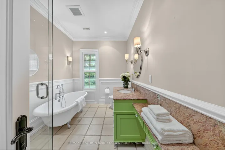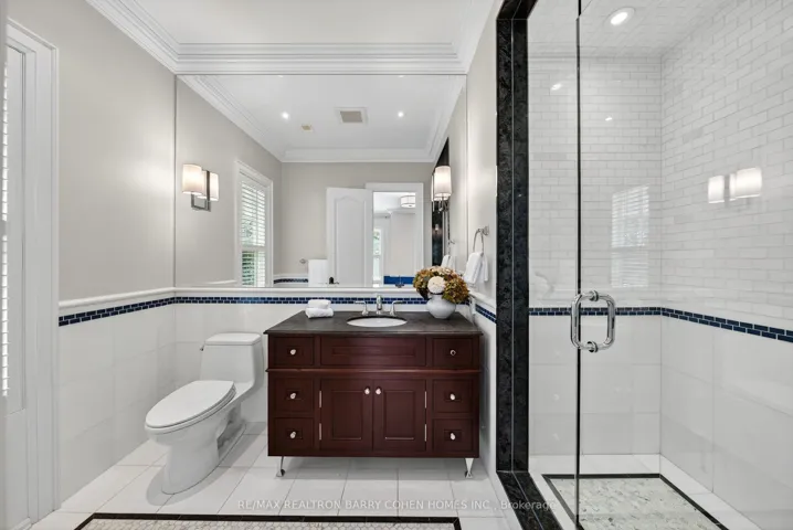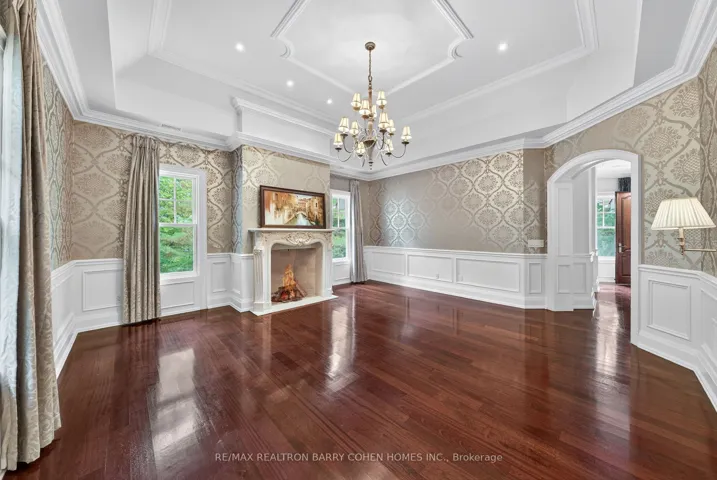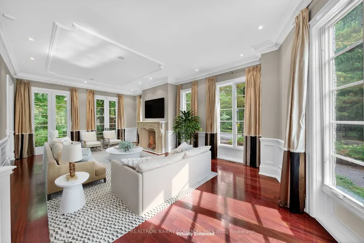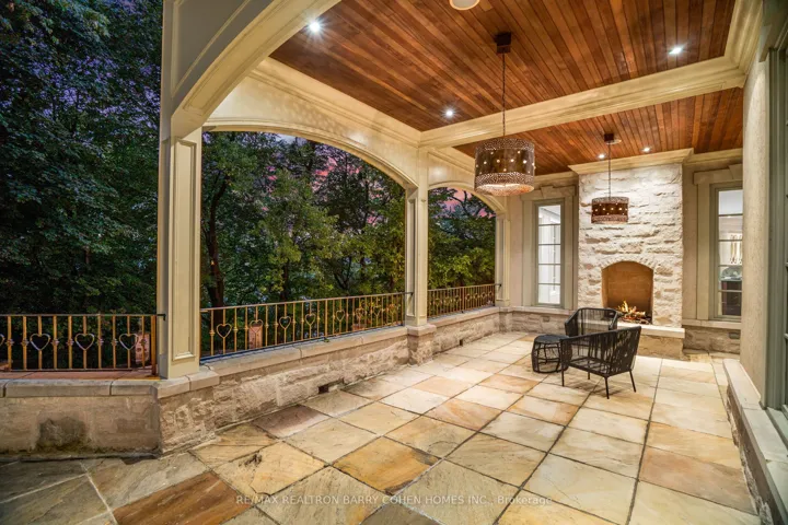 +"PublicRemarks": "Backs Onto Ravine! Perched gracefully at the highest point of Hoggs Hollow, this French Château inspired masterpiece sits on a spectacular 239.08 x 207.81 ft ravine lot (approx. 1.14 acres). Designed by Dee Dee Taylor Hannah and built by award-winning builder Michael Rossini, this timeless stone estate offers over 10,000 sq.ft. of luxurious living space, blending European elegance with modern comfort. The homes distinctive curved and symmetrical design showcases architectural artistry rarely seen today. Featuring 4 bedrooms with ensuites, 9 washrooms, and a 3-car garage with a circular driveway accommodating up to 15 cars, all principal rooms face west, overlooking the serene ravine. A grand marble foyer, curved hallways, and custom millwork opens to elegant living and dining rooms that walk out to the ravine and garden. Two libraries on main floor, five fireplaces, built-in speakers, 10-ft ceilings, and hardwood floors throughout. The gourmet kitchen with double granite islands and an open-concept family room with motorized curtains creates a warm and inviting space for entertaining.Step out to a 700 sq.ft. patio with outdoor fireplace and panoramic ravine views. The primary suite features a lavish 7-piece ensuite, his & her walk-in closets, and heated bathroom floors. The walk-out lower level wth heated floors includes a home theatre, wine cellar, sauna, wet bar, nanny/guest ensuite, and a recreation room with fireplace opening directly to the backyard oasis.The heated concrete pool with cascading waterfall, framed by mature trees, creates a private, resort-like retreat. A rare offering combining elegance, privacy, and tranquility, just moments from the Granite Club, top private schools (Crescent, TFS, Havergal, UCC, BSS), fine dining, and Rosedale & Don Valley Golf Clubs.A true statement of taste, craftsmanship, and enduring luxury in one of Torontos most prestigious enclaves."