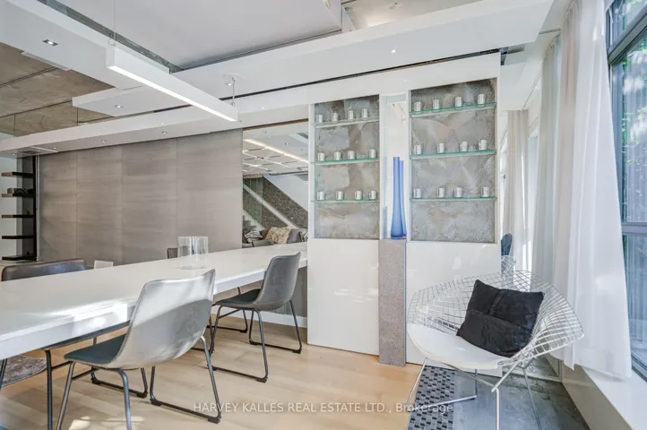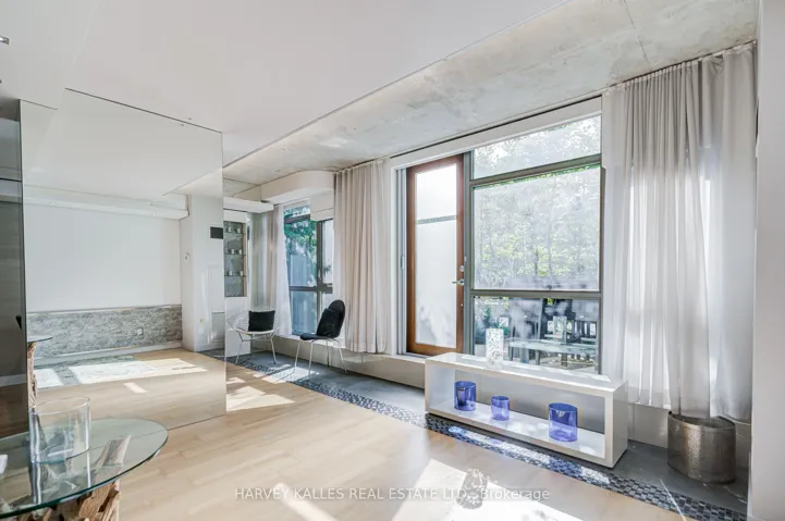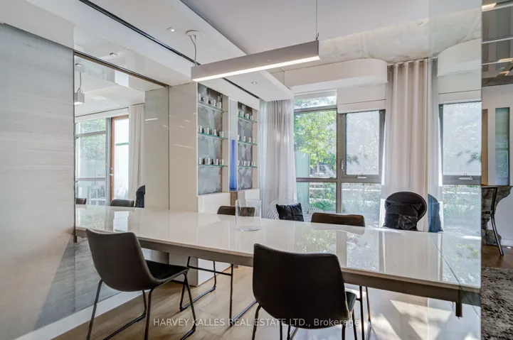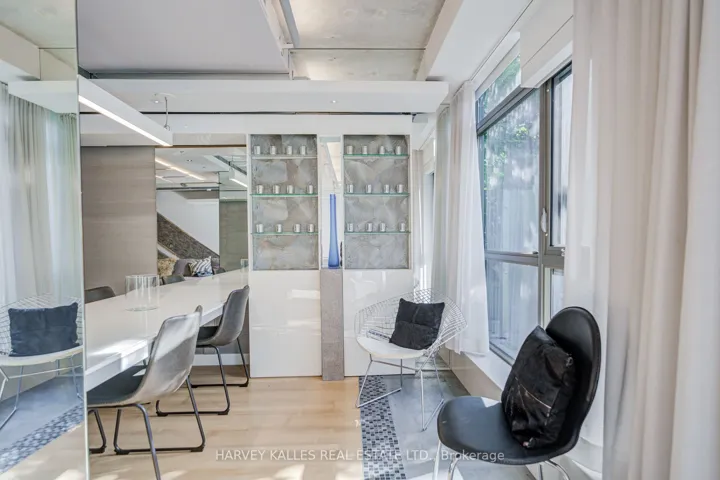 +"PublicRemarks": "Sophisticated Urban Living in the Heart of King West. Experience the best of city living in this executive two-bedroom townhouse at The One Hotel / Thompson Residences. Blending style, functionality, and privacy, this rare offering is perfectly tailored for professionals who value refined design and the convenience of a private front entrance. Enter through the building or your own front terrace overlooking the tranquil reflection pond at One Hotel and Victoria Memorial Parka serene setting for entertaining or quiet relaxation. Inside, the open-concept living and dining area is bathed in natural light from floor-to-ceiling windows, with dual walkouts to the terrace. The designer kitchen features a large island and a temperature-controlled wine room, while a stylish powder room and in-suite laundry complete the main level. Upstairs, the primary suite offers a peaceful retreat with a walk-in closet, a spa-inspired five-piece ensuite, and a private balconythe perfect spot for your morning coffee. The second bedroom also includes its own ensuite, double closet, and balcony access. Additional features include one parking space and a locker. Residents enjoy access to premium amenities such as a state-of-the-art fitness centre, rooftop pool, and exclusive venues including Harriets Rooftop and Casa Madeira at The One Hotel. With public transit, boutique shopping, and some of Torontos best restaurants just steps away, this home embodies elevated urban living at its finest."