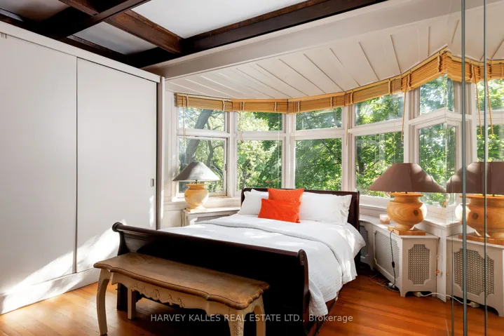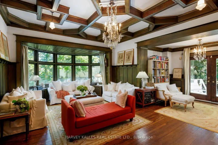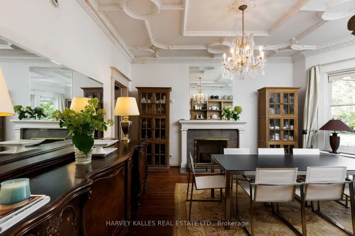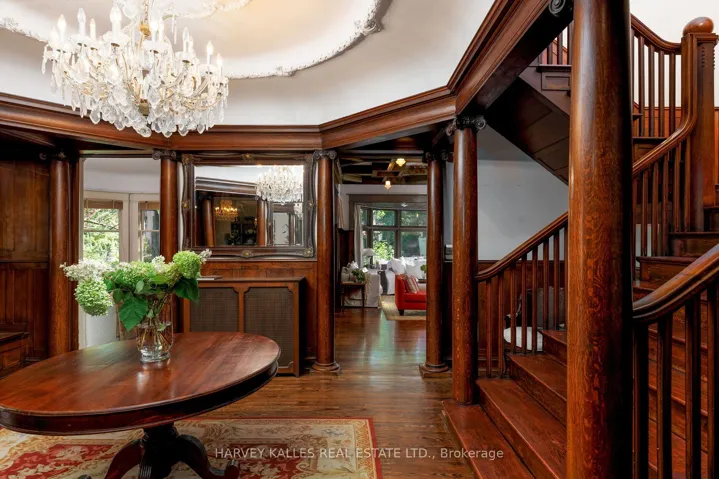 +"PublicRemarks": "Nestled in Toronto's prestigious Rosedale neighbourhood, this landmark mansion occupies an expansive 100' x 122' estate-sized lot and offers over 7,500 square feet of impeccably designed living spaces. With 7 + 1 generously proportioned bedrooms, 8 bathrooms, and an exceptional third-floor loft, this grand residence seamlessly blends historic architecture with the scale, elegance, and functionality. Originally built circa 1900 for the distinguished Applegate family, the home has been meticulously restored and thoughtfully maintained to preserve it's architectural heritage including a self portrait stain glass window of Mrs. Applegate herself. Drawing inspiration from the classical traditions of Italian Renaissance architect Andrea Palladiio - most notably his iconic Villa Rotunda in Vicenza, Italy - the home reflects timeless design and exceptional craftmanship. A majestic octagonal central hall, framed by twelve lonic columns, creates an unforgettable first impression and sets the tone for the rest of the residence. Throughout the home, rich period details abound: original oak hardwood floors, finely hand-craved oak mouldings and wainscoting, intricate millwork, and 6 fireplaces with decorative tile and brick hearths. The soaring 10-foot ceilings are adorned with ornate plaster crown mouldings, ceiling medallions, and oak-beamed details that speak to the home's historical significance. Expansive bow windows and beautifully preserved stained glass flood the interior with natural light and highlight the warm, elegant atmosphere. Outside, the property is a private oasis, surrounded by mature trees, lush landscaping, and tranquil gardens that offer rare serenity in the heart of the city. A detached two-car garage and additional parking for three vehicles provide added convenience. This is a once-in-a-generation opportunity to own a truly iconic Rosedale residence - an architectural treasure steeped in history and timeless charm."