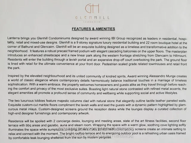 +"PublicRemarks": "Gym / Yoga room is now open. Live at one of the most luxurious buildings in Toronto managed by The Forest Hill Group. North facing new never lived in One bedroom and seperate room den 770 sq ft per builders floorplan plus terrace, one parking spot, one locker, all engineered hardwood / ceramic / porcelain and marble floors no carpet, marble floor and tub wall tile in washroom, upgraded stone counters, upgraded kitchen cabinets, upgraded Miele Appliances. Next door to Bialik Hebrew Day School and Synagogue, building and amenities under construction to be completed in Winter 2026, 23 room hotel on site ( $ fee ) July 1, 24 hr room service ( $ fee ), restaurant ( $ fee ) and other ground floor retail - to be completed Spring 2027, Linear park from Glencairn to Hillmount - due in 2027. Landlord will consider longer than 1 year lease term. Price reduced in lieu of amenities not being ready, take advantage today!"