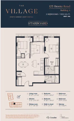 +"PublicRemarks": "*BONUS*1 MONTH FREE* Spacious "the STARBOARD Model" is 2 Bedroom, 2 full bathrooms and Open Concept Kitchen. Master with large Walk-in Closet (9.9x5.3ft) and overall spacious 1023Sq Ft of Luxury Living. Gorgeous Suite in a Wonderful Location - Steps to Lake & Marina! This PET FRIENDLY, Unique Luxury Rental, with 5-star Hotel Inspired amenities is nestled in Oakville's most vibrant and sought after neighbourhood, Bronte Harbour! This suite is Bright, Modern & Sleek in Design with Floor to Ceiling Windows thruout. Features an Upscale Modern Kitchen with Island, Contemporary Cabinets & Gorgeous Counters, Plus Stainless Steel Appliances. Gorgeous Wide-Plank flooring throughout & Convenient Full Size -In-suite Laundry. Note: Some Model Suite photos attached to aid in visualization of Finishes which are THE SAME for ALL UNITS. Room Size and floor plans vary with individual unit.* DOGS WELCOME*"
