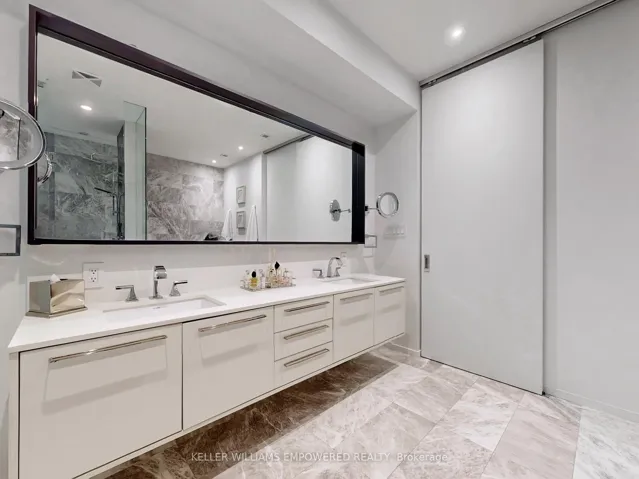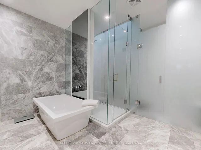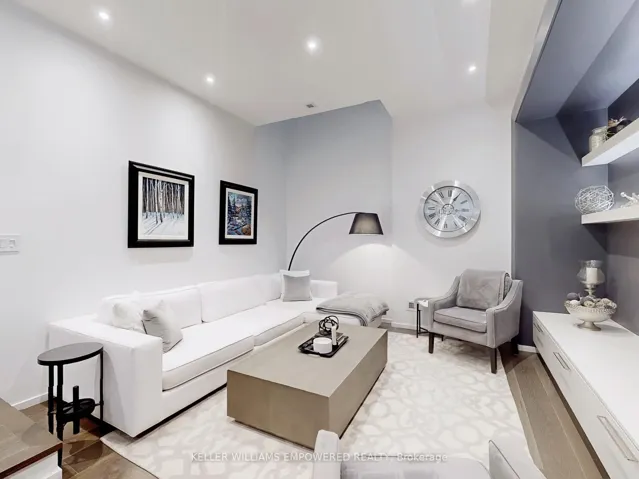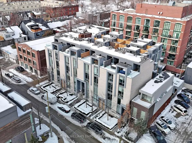 +"PublicRemarks": "An exceptional multi-level residence offering refined interiors, premium finishes, and a private rooftop terrace with skyline views. The rooftop terrace includes wood decking, glass enclosure for barrier-free city views, wood privacy fencing, covered barbecue and seating areas, and views of the downtown skyline including the CN Tower. The main floor features brushed oak flooring and 10-foot ceilings. The foyer offers a walnut paneled door with glass inset and frosted transom, and a guest closet. The open-concept dining room overlooks the front grounds through a floor-to-ceiling window and includes pendant lighting, built-in accent shelving with feature lighting, lower cabinetry, and a Sub-Zero dual-temperature wine fridge. The kitchen showcases stone countertops, glass backsplash, valence-lit cabinetry, Sub-Zero fridge/freezer, Asko dishwasher, a centre island with stone waterfall countertop, Wolf four-burner cooktop, Wolf oven, Panasonic built-in microwave, and seating for two. The living room features a skylight and built-in shelving with lower cabinetry. The second level offers a primary suite with floor-to-ceiling window wall, built-in desk and dresser, dressing quarters with mirrored cabinetry, and a marble-floored ensuite with double floating vanity, water closet, soaker tub, and glass-enclosed shower with rain head. The third level includes two bedrooms, one with a Romeo and Juliette balcony. New roof (2026) at seller's expense. Nearby local parks, including Trinity Bellwoods Park and Stanley Park. Within walking distance to a multitude of cafés, boutique shopping, dining and fitness studios along Queen Street, only steps to public transit. A short drive to STAKT Market and The Well, with easy access to Osgoode and King West."