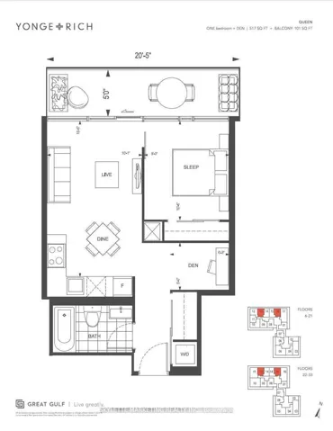 +"PublicRemarks": "1 Bedroom + Den | 517 sq ft interior plus a 101 sq ft oversized balcony | Includes parking and locker. Welcome to Yonge + Rich, where elevated urban living meets refined design. Enjoy soaring ceilings, floor-to-ceiling windows, a gourmet kitchen, and spa-inspired bathroom finishes. Ideally located just steps to the subway, PATH, Eaton Centre, U of T, and the Financial and Entertainment Districts. Distinctive, elegantly appointed private residences offering the very best of downtown living."