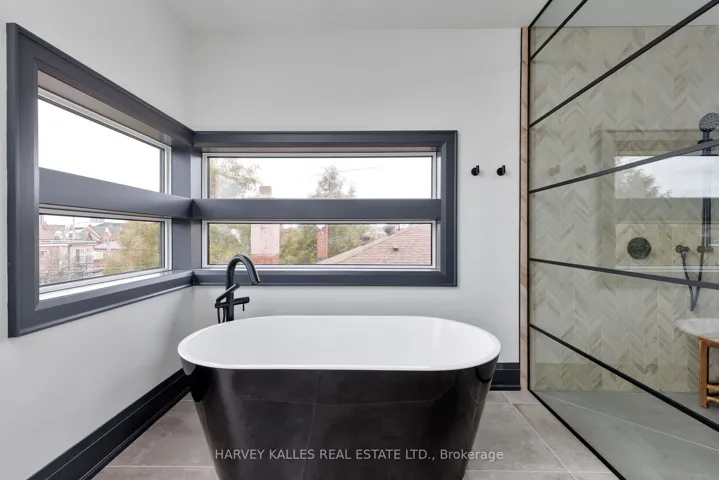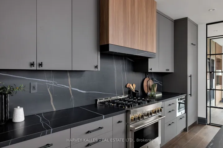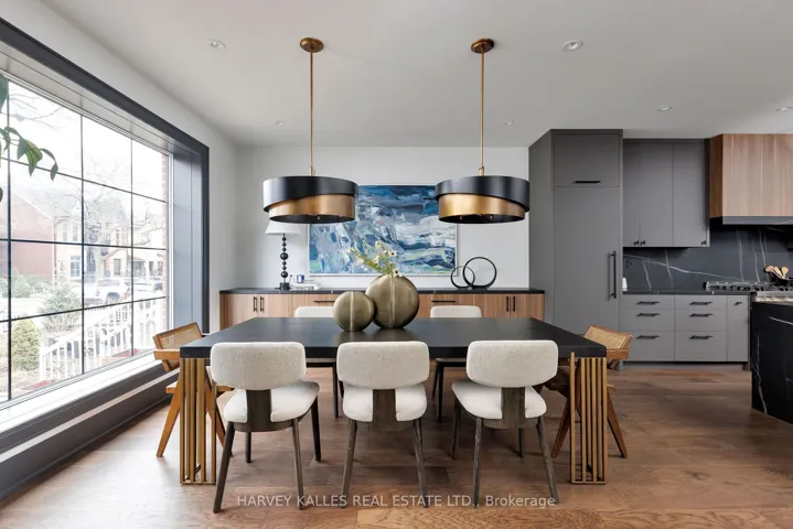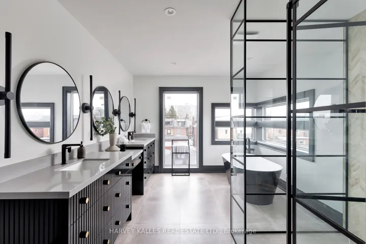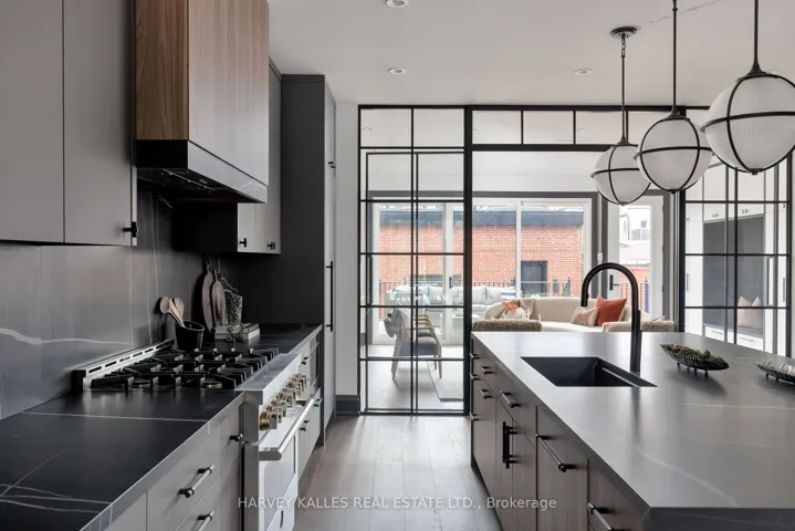 +"PublicRemarks": "Toronto's take on a New York-inspired industrial soft loft. A rare detached family home offering nearly 4,500 sq ft of living space across four levels, with approximately 3,100 sq ft above grade, set on a 27.98-ft wide lot. Neighbourhood-defining interior design by Glen Peloso.The bright, wide-plank main level features an east-facing dining area flooded with natural light, flowing into a custom chef's kitchen with oversized island, separate built-in refrigerator and freezer, bespoke lighting, and exceptional storage. Factory-inspired glass walls and double doors lead to an elegant family room with fireplace, custom built-ins, and a full wall of glass opening to a large outdoor deck. A rear mudroom with built-in seating and storage adds everyday functionality. Powder room finished with custom New York streetscape wallpaper.The primary retreat occupies the entire third floor, introduced by a dramatic landing with an east-facing sunroom wrapped in floor-to-ceiling windows, complete with coffee station and wet bar. Step out to a city-view observation deck with open eastern exposure. The primary bedroom features abundant natural light, custom built-ins, and fireplace, complemented by a spa-like ensuite and an exceptional walk-in dressing room with centre island, skylight, and extensive shelving.The second floor offers a large bedroom with private 4-pc ensuite, two additional generous bedrooms with balcony access, a full laundry/utility room, and an additional 4-pc bath.The lower level spans approximately 1,200 sq ft, featuring a substantial recreation room, glass-enclosed wine cellar, nanny or guest suite, 4-pc bath, and cantina. Large 2.5-car garage with laneway access. Dual HVAC systems."