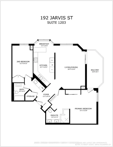 +"PublicRemarks": "An exceptional downtown residence offering space, privacy, and finish rarely found in condo living. Welcome to Jarvis Gardens: a boutique building, known for long-term ownership and limited turnover in the heart of the city, featuring a fully renovated 2-bedroom, 2-bath home designed for long-term comfort and everyday ease.This suite offers 1,300+sq. ft. of interior space with a split-bedroom layout providing true separation of living areas. The open-concept living and dining space is filled with natural light and opens to a large southeast-facing balcony with open city views, ideal for entertaining in luxury or quiet evenings at home.Engineered hardwood flooring runs throughout, complemented by heated tile flooring at the entrance, and clean, contemporary finishes. The kitchen features quartz countertops, premium integrated appliances, a breakfast bar, and a custom laundry area offering quartz counter tops, additional prep space, large sink and storage, a highly functional upgrade.The primary bedroom includes balcony access, custom integrated closets, and a renovated ensuite with heated floors, double vanity, and oversized glass shower with multi-jet shower heads. The second bedroom is generously sized and located beside a full bathroom, suitable for guests, a roommate, or home office use.Jarvis Gardens is a quiet, well-managed pet friendly building with only 44 suites and just 4 units per floor. Amenities include rooftop terrace with garden plots, gym and yoga studio, sauna, party room with walk-out patio and BBQ, and on-site superintendent. Parking and large ensuite storage included.Steps to St. Lawrence Market, Financial District, TTC, parks, cafés, and daily essentials. This is downtown living without compromise, offering space, quality, and a layout designed to grow with you."