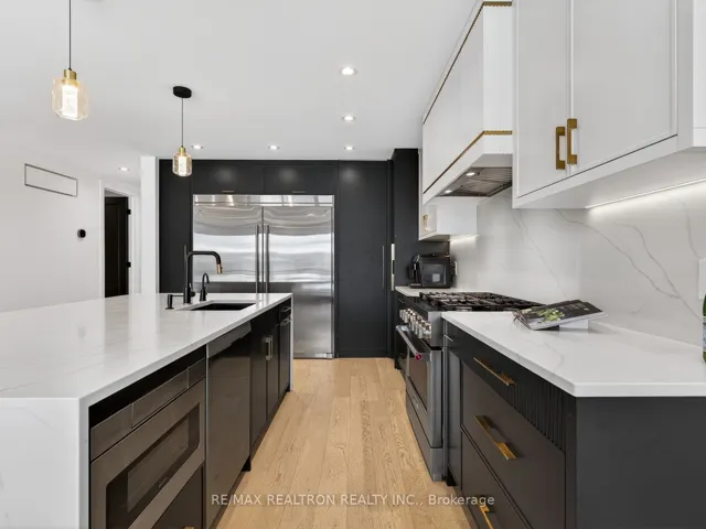 +"PublicRemarks": "Welcome to this stunning & completely renovated family home (2025) at Bathurst and Sheppard! Thoughtfully redesigned from the studs up with the owner investing close to $500,000 in renovations. Set on a rare ravine lot with the largest backyard on the street, this home preserves its original brick exterior while delivering modern comfort, efficiency, and space for everyday family living.The heart of the home is the bright open-concept kitchen, dining, and living area, ideal for gathering and entertaining. The chef's kitchen features a stunning 8.75ft waterfall quartz island with storage on both sides, 3cm quartz countertops, a full-height book-matched backsplash, custom cabinetry, and premium appliances including a 36" six-burner gas range. A walk-in pantry adds everyday convenience.Designed with families in mind, the home offers 7.5ft solid wood doors, durable 6" white oak hardwood floors, modern pot lighting, and floor-to-ceiling built-ins in every room for exceptional storage. The finished lower level features matching high-end vinyl flooring and is fully plumbed, wired, and vented for a second kitchen, ideal for an in-law suite or future flexibility.The functional layout includes 3+1 bedrooms, 3 full bathrooms, and two sound-proofed home offices, perfect for remote work, study, or quiet retreat. Smart home upgrades, updated mechanicals, and energy-efficient construction provide peace of mind.Enjoy outdoor family time on the 30ft rear deck, 14ft front balcony, and expansive ravine backyard, plus parking for up to four vehicles. Located in a high-ranking school district and ideally positioned minutes to Hwy 401, Sheppard West subway, with a bus stop down the street, and easy access to downtown, shopping, dining, and entertainment-this is a true turn-key family home in a connected, sought-after neighbourhood."