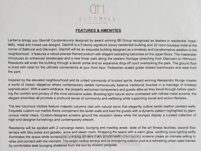 +"PublicRemarks": "Gym / Yoga room is now open. Live at one of the most luxurious buildings in Toronto managed by The Forest Hill Group. Sunrise East facing new never lived very spacious 641 sq ft per builders floorplan plus balcony, one parking spot, one locker, all engineered hardwood / ceramic / porcelain and marble floors no carpet, marble floor and tub wall tile in washroom, upgraded stone counters, upgraded kitchen cabinets and stone backsplash, upgraded Miele Appliances. Next door to Bialik Hebrew Day School and Synagogue, building and amenities under construction to be completed in Summer 2026, 23 room hotel on site ( $ fee ), 24 hr room service ( $ fee ), restaurant ( $ fee ) and other ground floor retail - to be completed by end of 2026, Linear park from Glencairn to Hillmount - due in 2027. Landlord will consider longer than 1 year lease term. Price reduced in lieu of amenities not being ready, take advantage today!"