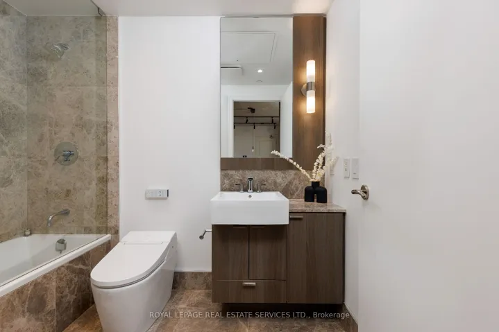 +"PublicRemarks": "Welcome to Bisha Hotel & Residences, where iconic design meets sophisticated downtown living. This fully furnished with pristine furniture, meticulously renovated luxury suite is available for lease and offers a turnkey opportunity in the heart of the city. Thoughtfully redesigned from top to bottom, the suite features a fully automated smart home system controlled by an in-suite i Pad or smartphone, including Lutron dimmable lighting, SONOS built-in speakers, Nest Wi Fi thermostat, smart bidet toilet, and motion-sensor faucet. The bright open-concept layout showcases 9-foot exposed concrete ceilings, 7.5" European White Ash engineered hardwood floors, and sleek designer baseboards. The living and dining area is anchored by custom millwork with integrated ambient lighting and a Samsung 55" QLED TV, while floor-to-ceiling sliding doors open to a private balcony with premium composite decking and captivating city views. The chef-inspired kitchen boasts quartz countertops and backsplash, integrated high-end appliances, valance and track lighting, and a functional centre island with a linear suspension chandelier. The primary bedroom offers custom millwork, pendant lighting, and a double sliding-door closet with motion-sensor lighting and glass panels. A versatile den with floor-to-ceiling windows is ideal as a home office or lounge. The spa-like 4-piece bath features a floating vanity, oversized mirror, custom glass shower enclosure, smart bidet toilet, and motion-sensor faucet. Residents enjoy 5-star amenities including 24-hour concierge, fitness centre, meeting rooms, rooftop deck, and the iconic infinity pool. Steps to the Rogers Centre, Metro Toronto Convention Centre, Roy Thomson Hall, and world-class dining and transit. A rare opportunity to lease a fully furnished statement in modern luxury living. 6 MONTH LEASE ONLY - Unit will continue to be available for Sale and Tenant must accommodate showings."