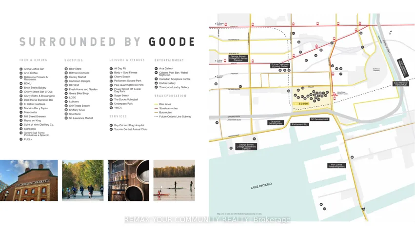 +"PublicRemarks": "Welcome To The Goode, Where Contemporary Design Meets The Timeless Character Of Toronto's Coveted Distillery District. This Brand New, Never-Lived-In Studio Presents An Exceptional Opportunity To Experience Refined Urban Living In One Of The City's Most Vibrant Neighbourhoods. Designed With Effortless Flow & Framed By Floor-To-Ceiling Windows That Invite Abundant Natural Light, The Suite Showcases An Elegant Quartz Countertop & Matching Backsplash, Under-Cab Lighting,Integrated Laundry Storage & a Discreet B/I Waste Bin That Enhances Everyday Functionality. Enjoy Tranquil Views Overlooking The Outdoor Swimming Pool Extending To Lake. The Layout Maximizes Efficiency While Maintaining a Clean,Modern Aesthetic,Ideal For Professionals Or Students Seeking Style & Practicality.Step Outside To Boutique Shops,Acclaimed Dining,Galleries & Year-Round Cultural Events,Including The Distillery Winter Village.Walk To St. Lawrence Market,Relax In Corktown Common Or Enjoy Waterfront Access At Parliament Slip.George Brown College & The Emerging East Harbour District Are Within Easy Walking Distance.Commuting Is Seamless w/ TTC Streetcar Service At Your Doorstep,Quick Connections To Union Station & Access To The DVP & Gardiner Expressway.The Future Corktown Station On The Ontario Line Will Further Elevate Transit Accessibility.Residents Enjoy Resort-Inspired Amenities Including:Lobby Lounge w/Fireplace,24-Hour Concierge,Fully Automated Parcel System,Pet Spa& Bike Parking.Wellness & Recreation Are Elevated With Indoor Fitness Facilities,Yoga Studio & Outdoor Swimming Pool.Two Landscaped Terraces (2nd + 10th Fl)Offer Social & Creative Spaces Including Co-Working Lounge,Games+Party Room,Sun Deck, BBQ Area,Garden Spaces& Dedicated Outdoor Seating + Work Zones.With Inspired Architecture,Vibrant Surroundings & Exceptional Transit Access,This Studio Represents a Standout Opportunity For Chic Urban Living In One Of Toronto's Most Dynamic Communities."