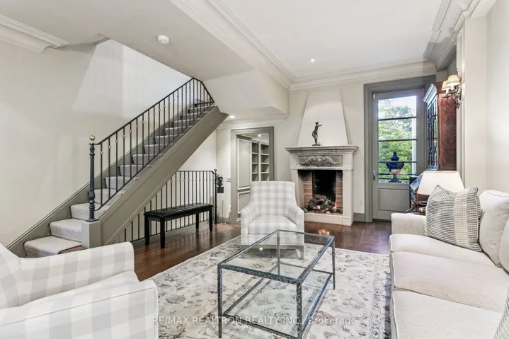 +"PublicRemarks": "Nestled in the prestigious Yorkville neighbourhood, this exquisite renovated 1880s heritage townhouse masterfully blends the charm of an English country cottage with modern luxury. Showcasing the highest standards of craftsmanship, this three-level residence offers over 2,000 square feet of refined living space, where warmth, character, and European-inspired sophistication abound. The thoughtfully designed interior features antique elm flooring, limestone gas fireplaces, custom millwork and soaring ceilings that flood the home with natural light. Every detail reflects a commitment to timeless quality and elegance. The main floor welcomes you with a gracious foyer leading to a formal living room highlighted by a bay window and limestone fireplace. A bespoke library, complete with intricate millwork and built-ins, opens through French doors onto a balcony overlooking the serene greenery of Ramsden Park. A stylish powder room with imported Parisian wainscoting adds to the charm of the home. The home features a country-style eat-in kitchen, equipped with an iconic AGA stove, walk-in pantry, Belgian blue stone countertops, custom cabinetry, elm ceiling beams, and heated French limestone floors. The adjacent dining and family rooms (or optional guest bedroom) flows into a landscaped, French-inspired garden. The serene primary bedroom features custom built-ins, a walk-in closet. There is a spa-like five-piece bathroom with Carrara marble and limestone. The second bedroom features wood-panelled cathedral ceilings, skylight, and Juliette balcony overlooking treetops, offering a tranquil hideaway. Designed with flexibility in mind, the home accommodates 2 to 4 bedrooms and includes the rare convenience of two-car parking via the laneway. Ideally located just steps from Yorkville's renowned boutiques, fine dining, top-rated schools, parks and has easy access to Rosedale Subway."