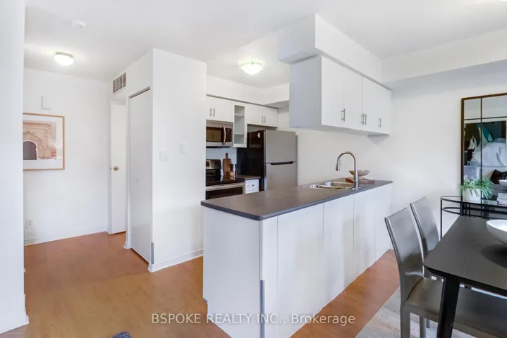 +"PublicRemarks": "Almost 1,000 sq. ft. across three levels plus a private rooftop deck with a BBQ gas line and city views this Liberty Village townhouse is a smart step up from condo living. The main floor features an open kitchen, living, and dining area with windows overlooking a rose garden, along with a convenient powder room. Upstairs, two well-proportioned bedrooms - larger than the neighbourhood norm - share a full bathroom and an upgraded washer/dryer. The third level opens to a spacious roof terrace, ideal for barbecues, casual dinners, or unwinding with the skyline in view. Parking includes a built-in bike rack, and the oversized locker sits right beside the space for easy storage. The community is pet-friendly, with a dog park nearby. Move in and enjoy the space as it is, with the flexibility to update on your own timeline and make it truly yours."