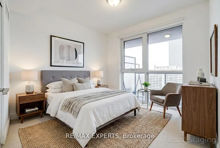 +"PublicRemarks": "Spacious west facing 1 bedroom suite with unobstructed views, an exceptional layout, and over 750 sqft of living area. Featuring a large modern kitchen with stainless steel appliances, expansive countertops, and a generous breakfast bar perfect for dining and entertaining. The open-concept living area is bright and inviting with large windows and plenty of natural light. The oversized bedroom easily accommodates a King bed, includes a large closet with built-in shelving, and a custom built-in makeup area with wardrobe, display shelving, and desk. Enjoy a stylish bathroom with large glass shower and ample counter space. Conveniently located close to restaurants, supermarkets, Eglinton GO, TTC, Kennedy Station, New Eglinton Crosstown LRT, STC. Includes 1 parking space and 1 locker for added convenience. A great opportunity for first-time buyers, small families, or down-sizers. Don't miss this chance to call it your home!"
