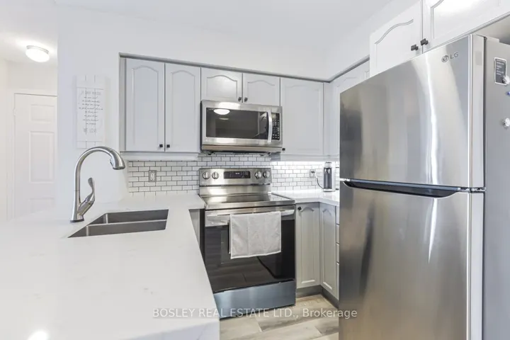 +"PublicRemarks": "Spacious and beautifully updated 2-bedroom, 2-bath residence in sought-after Bellair Gardens, complete with the rare offering of two side-by-side parking spaces. Enjoy sweeping southwest skyline views from this bright, well-appointed suite, ideally located near major highways, shops, trails, the TTC, and everyday conveniences. The modern kitchen features quartz countertops, a striking waterfall island, stainless steel appliances, and a custom backsplash. A highly functional split-bedroom layout provides excellent privacy, while floor-to-ceiling windows flood the living space with natural light. Vinyl flooring throughout the living areas adds a fresh, contemporary feel, making this home ideal for comfortable everyday living and entertaining."