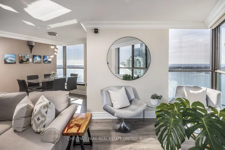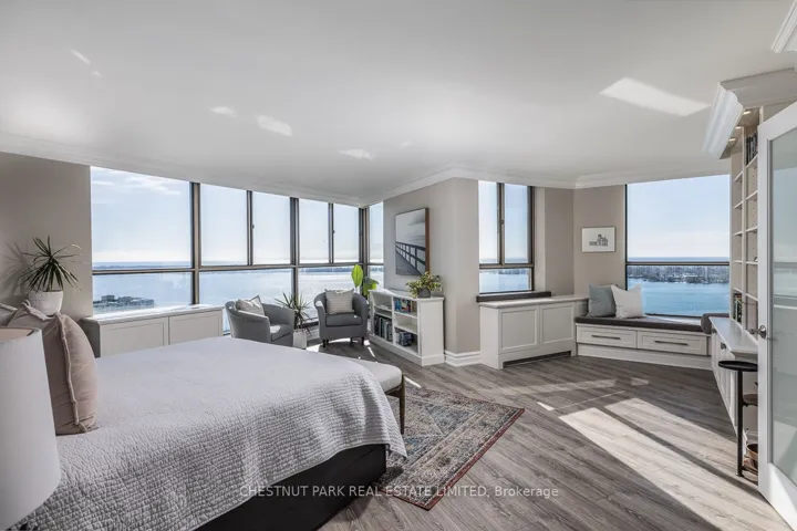 +"PublicRemarks": "Breathtaking sunrises to sunsets from this one-of-a-kind 1,740 sq. ft. south-facing PENTHOUSE! Literally perched atop Lake Ontario, this fully renovated split-plan suite offers expansive, unobstructed, forever views of the Toronto Islands and the city skyline, stretching all the way to the U.S. With exceptional space, light, and flow, the suite feels very much like a bungalow in the sky. The sleek, contemporary chef's kitchen was renovated in 2024 and features ample storage, quartz countertops, pantry cupboards, double drawers, and a wine fridge. The extra-large primary suite showcases incredible views of the city skyline and lake, along with two seating areas, custom built-ins, a small office area, a large walk-in closet, and a stone, spa-inspired ensuite. The dining area overlooks the famed Toronto Islands. The spacious living area features custom cabinetry and an electric fireplace, while a separate bar area offers the option for a second dining space. The second bedroom includes a large double closet and stunning west-facing views of parkland and the Toronto skyline. Additional features include Hunter Douglas electric blinds, a smart lighting system, two designated side-by-side parking spots, and two oversized lockers. Enjoy a newly renovated, notable rooftop terrace with BBQs just one floor away. TTC is right at your door, with minutes to the Financial District, Harbourfront, Billy Bishop Airport, and the UP Express. This waterfront downtown penthouse truly has it all! Note: Fibre internet and cable are included in the maintenance fee."
