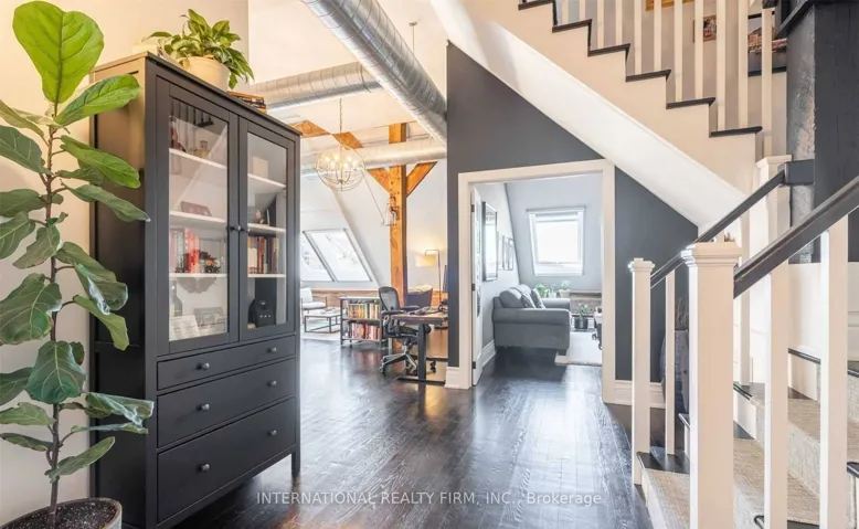 +"PublicRemarks": "Experience the drama of true hard-loft living in PH16 at the iconic Stinson School. This isn't just a condo; it is 1,688 sq ft of architectural history. You are immediately greeted by soaring 20-foot ceilings, original exposed brick, and massive skylights that flood the space with natural light. The main floor is an entertainer's dream with rustic timber beams and warm hardwood floors. Upstairs, the layout separates "living" from "resting" with a dedicated executive den featuring a cozy fireplace-perfect for a home office. The primary retreat offers a massive walk-in closet and a spa-inspired 5pc ensuite. South-west facing, you get breathtaking sunset views over the Escarpment and city skyline. Walkable to the GO Centre and hospitals. This is a trophy property-don't miss it."