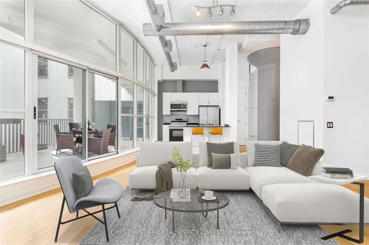 +"PublicRemarks": "Rarely available, stunning, authentic renovated loft at the iconic Merchandise Building, with a rarely available 300 sq ft TERRACE. Exquisitely finished with quality in both workmanship and details. A space you will love to go home to, have your friends for dinner inside or on the TERRACE with a glass of wine. Wonderful flow, Fantastic spa/hotel 5 Star amenities, downtown living at its best. Storage galore, spacious bedroom, soaring ceilings, spacious with natural light. Experience the perfect scale of industrial history with a very modern touch and finishes. Located in the heart of downtown, steps to all your shopping needs, coffee shops and a new 24/7fitness - all conveniently located on main floor retail. Short stroll to the TMU, the financial district, major and minor transportation. Amazing Landlords."