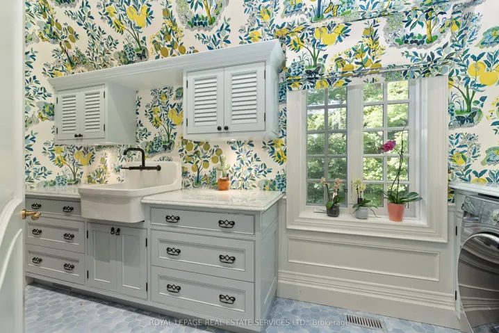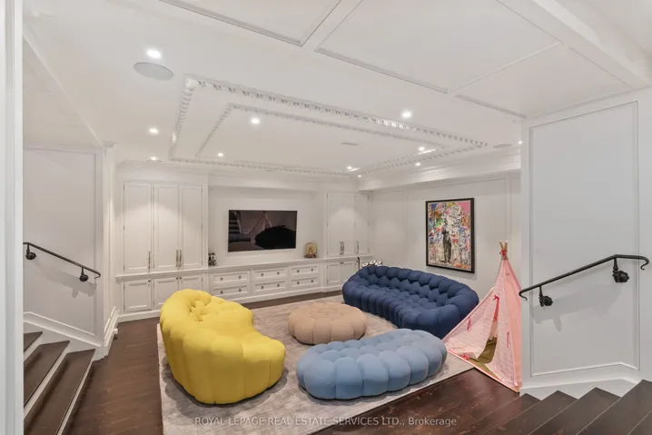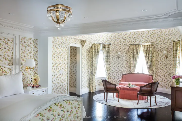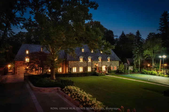 +"PublicRemarks": "As one of Toronto's original landmark estates, the 'Rosewood Estate' sets the bar for uncompromising luxury in the city. Tucked discreetly at the end of a quiet cul-de-sac, the residence rests on a sprawling 1.12 acre private ravine lot. Reimagined in 2019 by acclaimed architect Lorne Rose, with interiors by Dvira Interiors, and built to exacting standards by JTF Custom Homes, the home is a masterclass in vision, craftsmanship, and enduring design. The approach is cinematic: a stone and wrought iron fence opens to manicured gardens, mature maple trees, and imported European planters that frame the limestone facade and cedar roofline. A heated drive and walkways lead to grounds designed for both grandeur and privacy, where an elegant saltwater pool, cabana, outdoor kitchen, fireplace, and a full sports court are seamlessly woven into the landscape. The gardens dissolve into a lush ravine backdrop, offering rare tranquility within the city. Inside, nearly 12,000 square feet of living space unfolds with quiet confidence. Timeless custom crown moulding and wainscoting, hand-carved marble fireplace mantels, and imported European wallpaper and hardware create a layered, textural narrative throughout. Built-in cabinetry and vanities by Falcon Kitchens anchor the principal rooms, while marble counters, bespoke lighting, custom drapery, and automated blinds reflect meticulous attention to detail. The chef's kitchen is equipped with a suite of luxury appliances, including a La Cornue range, and flows effortlessly into both formal living spaces designed for modern family life. The upper levels offer five serene bedrooms, including a primary retreat with soaring vaulted ceilings, dual bespoke dressing rooms, and a lavish marble-clad ensuite. The lower level rivals a private club, complete with a state-of-the-art theatre, glass-enclosed gym, recreation spaces, a nanny suite, and a large laundry room. Rosewood Estate is not merely a residence, it is a legacy property."