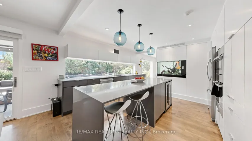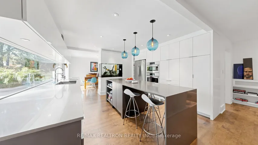 +"PublicRemarks": "This exceptional modern European-inspired residence, located in the prestigious Banbury enclave, has been meticulously reimagined both inside and out with the finest materials and unparalleled craftsmanship. Designed by renowned architect Richard Librach and complemented by professionally landscaped gardens by Wendy Berger, this home is a true expression of refined luxury and timeless elegance. Rich maple hardwood flooring, extensive custom millwork, and thoughtfully curated living spaces create a warm yet sophisticated ambiance throughout. The gourmet chef's kitchen is a true showpiece, featuring a striking window backsplash that frames serene views of the beautifully landscaped backyard. A dramatic two-sided 160-gallon aquarium serves as a stunning architectural centerpiece, seamlessly connecting the kitchen and dining areas. The primary suite offers a private retreat, highlighted by vaulted ceilings, a spa-inspired ensuite, and a spacious walk-in closet complete with custom built-in storage. Sun-filled spacious bedrooms with closets are ideal for big family. The fully finished lower level provides exceptional flexibility, featuring a dedicated home theatre, additional bedrooms, and ideal accommodations for a nanny suite, in-laws, or guests, ensuring both comfort and privacy. Step outside to a tranquil, Zen-inspired backyard oasis, designed for both relaxation and effortless entertaining. This outdoor sanctuary showcases elegant granite slab walkways, a calming pond, and lush, mature landscaping. The custom pergola is equipped with automatic screens, infrared heaters, and integrated outdoor speakers, allowing for seamless year-round enjoyment. Ideally situated just minutes from Denlow, Yorkmills CI, private schools, upscale shopping, fine dining, public transit, and with convenient access to Highway 401 and the DVP, this remarkable residence offers an unparalleled blend of luxury, lifestyle, and location."