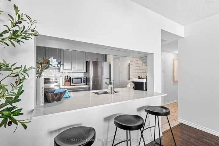 +"PublicRemarks": "Welcome to 1665 Pickering Parkway- a beautifully upgraded two bedroom plus den condo located in prime Pickering. Enjoy a central location surrounded by shops, restaurants, the Pickering Public Library, and the Esplanade Park, just minutes from the GO Station and Highway 401.The main living area offers a spacious and functional layout, with the dining and living spaces connected in an open concept design. The recently remodelled kitchen features stainless steel appliances, quartz countertops, tile flooring, and a convenient breakfast bar. A passthrough window overlooking the living room allows natural light to brighten the kitchen area. There are two bedrooms plus a versatile den or solarium, providing plenty of room for living and working. The primary bedroom is bright and inviting, featuring floor to ceiling windows and a walk in closet. The solarium is flooded with natural light through its own floor to ceiling windows, making it an ideal space for a home office, or reading nook! Additional features of the condo include: two parking spots, one locker, brand new elevators, and ensuite laundry with a new washer and dryer. The condo is located in Emerald Point Condos, which has been recently updated with refreshed interior hallways and doors. Residents enjoy excellent amenities such as a pool, hot tub, sauna, racquetball court, gym, and meeting room. This beautiful condo in an unbeatable location is a must see!"