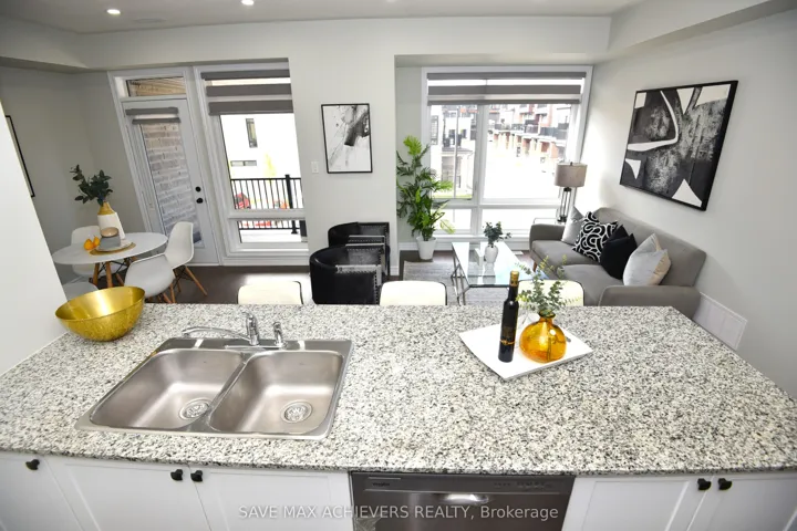 +"PublicRemarks": "GORGEOUS 3-STOREY TOWNHOME LOCATED IN HIGHLY SOUGHT-AFTER SOUTH EAST AJAX, ONLY 1.5 YEARS NEW. FRESHLY PAINTED AND POT LIGHTS INSTALLED THROUGHOUT. THE GROUND FLOOR FEATURES A BRIGHT DEN WITH STAINED OAK FLOORING, OAK STAIRCASE, AND A 2-PC BATH. THE MAIN FLOOR OFFERS AN OPEN-CONCEPT LAYOUT WITH A MODERN GRANITE KITCHEN, UPGRADED WOOD CABINETRY, BREAKFAST BAR, AND HIGH CEILINGS. THE SPACIOUS LIVING AND DINING AREA BOASTS STAINED HARDWOOD FLOORING, AN ADDITIONAL 2-PC BATH, AND A WALK-OUT TO A BALCONY. LARGE WINDOWS THROUGHOUT PROVIDE ABUNDANT NATURAL LIGHT. THE THIRD FLOOR FEATURES HIGH CEILINGS, A LINEN CLOSET, AND A CONVENIENT LAUNDRY ROOM. TWO GENEROUSLY SIZED BEDROOMS INCLUDE A PRIMARY BEDROOM WITH A 4-PC ENSUITE, WALK-IN CLOSET, AND PRIVATE BALCONY. THE SECOND BEDROOM OFFERS A CLOSET, LARGE WINDOW, AND ACCESS TO A MODERN 3-PC BATH WITH GLASS SHOWER. BRIGHT, SPACIOUS, FRESHLY UPDATED, AND IMPECCABLY MAINTAINED A MUST-SEE!"