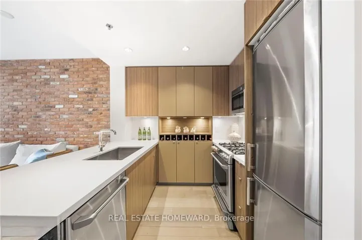 +"PublicRemarks": "Set in the heart of Leslieville, Showcase Lofts puts you right where you want to be-steps to Queen Street East, local coffee spots, indie shops, neighbourhood favourites, and easy TTC access. Whether you're heading downtown or out of the city, the DVP and Gardiner are close at hand.This one-bedroom condo offers 635 sq. ft. of smart, well-finished living space with a 40 sq. ft. balcony. The open layout features a reclaimed-brick accent wall, floor-to-ceiling windows, high ceilings, wide-plank hardwood floors, and a balcony overlooking the courtyard-perfect for a quiet coffee or evening wind-down.The kitchen blends style and function with woodgrain cabinetry, under-cabinet lighting, quartz countertops, built-in wine storage, an island with seating, pot lights, and stainless steel appliances. In-suite laundry with a stacked washer and dryer keeps things easy.The bedroom is spacious, with a walk-in closet and its own walkout to the balcony. The four-piece bathroom is clean and modern, finished with quartz counters and a deep soaker tub with shower.One parking space and one locker are included for ultimate convenience. Residents also have access to concierge service, a fully equipped gym, media and party rooms, guest suites, and a ground-level patio."