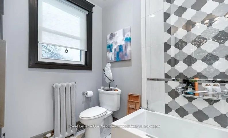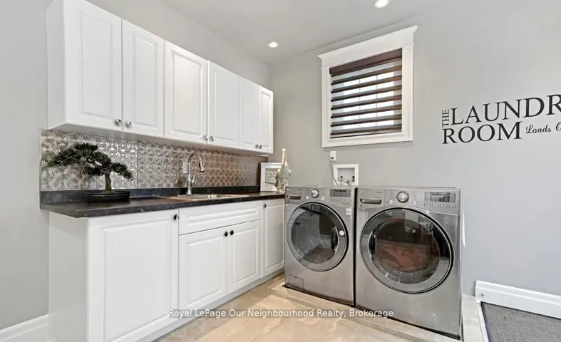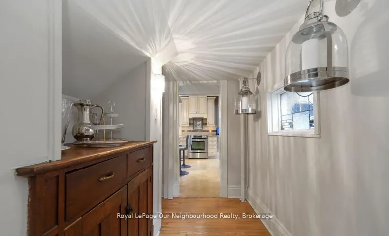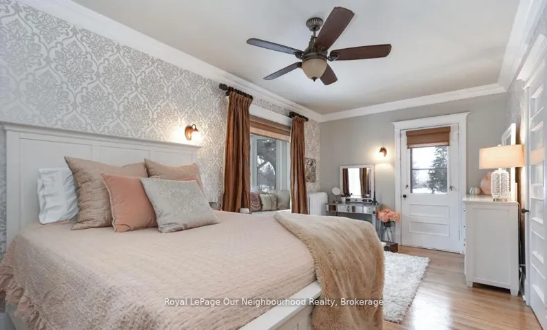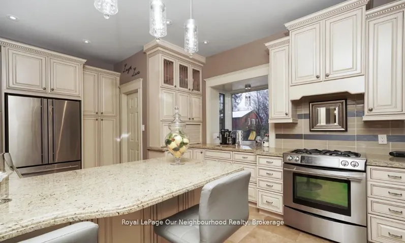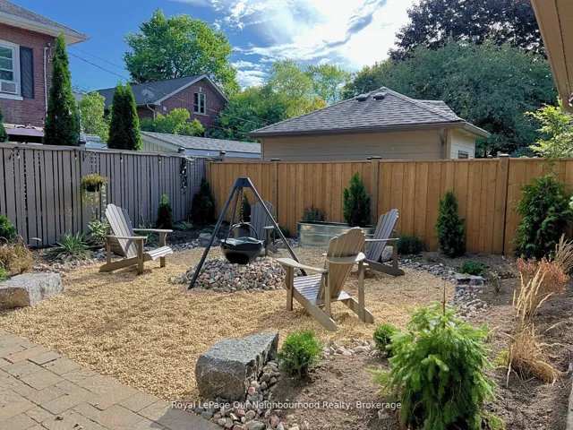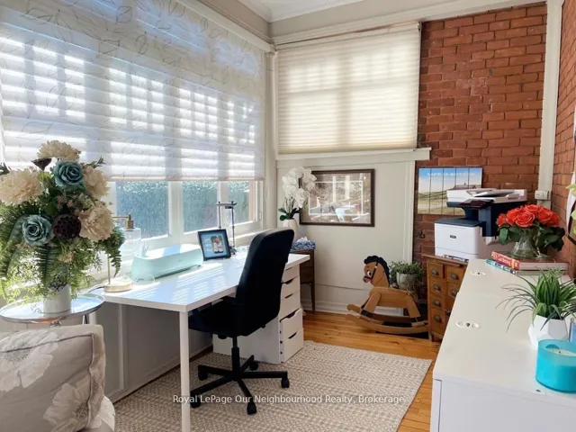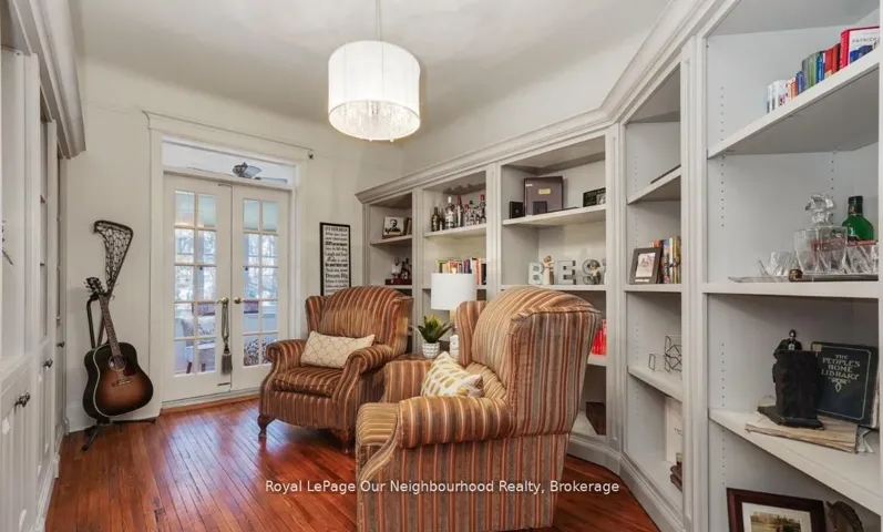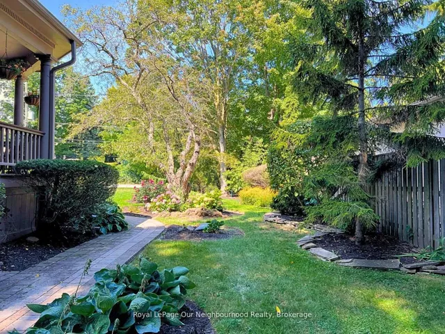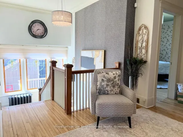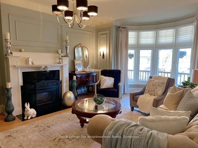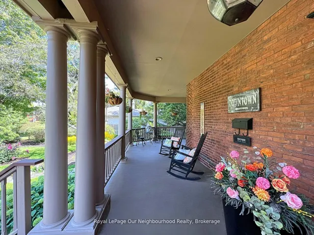 +"PublicRemarks": "Create your very own Downton Abbey and experience the perfect blend of historic charm and contemporary elegance. This remarkable residence showcases timeless character alongside modern finishings, inviting you to live your best life surrounded by beauty and sophistication.From the moment you enter, soaring grand ceilings on both the main and second floors set the tone for the home's stately presence. Original hardwood floors span the first two levels, preserving the rich charm of yesteryear, while tasteful decor and oversized rooms create an atmosphere of refined comfort.The beautifully appointed kitchen features travertine flooring, an inviting eat-in area, and a walkout to the backyard oasis. Enjoy quiet mornings or evening gatherings on the cozy wraparound porch with pot lights, or in the enclosed sunroom overlooking lush, English-inspired gardens and a tranquil babbling brook pond.Upstairs, each spacious bedroom offers walk-in closets and grand ceilings, while the large laundry room-with its own walkout to a deck-makes chores a pleasure. The deck connects to a private gym and 3-piece bath located above the heated garage.The third floor is your private master retreat-a true sanctuary featuring a wraparound walk-in closet with custom built-ins, corner gas fireplace, and a stunning en-suite. Relax in the claw-foot tub or steamer shower, warmed by the gentle glow of a Napoleon electric fireplace. The large heated loft garage includes hydro, a garage door openers with remotes, and access from both the backyard and laundry room.Outdoors, the property is an absolute haven. Set on a rare double lot, the backyard offers mature perennial gardens, two ponds, a serene fire pit area, and a new fence providing privacy and peace. Enjoy natural gas hookups for your BBQ and future outdoor fireplace-perfect for entertaining in every season. New Fencing installed Fall 2024. Survey on File 2023. Walking distance to Trafalgar Castle (Private School) and Henry St High."