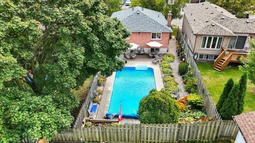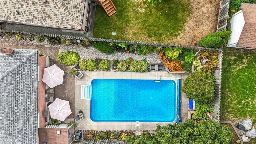 +"PublicRemarks": "Welcome to the Rose Garden subdivision! This charming raised bungalow has everything you need and then some. Step inside to find dark laminate flooring throughout the living room and bedrooms, setting the tone for a warm, inviting space. The open-concept eat-in kitchen features a bright bay window, plenty of cupboard space, a moveable island, and a side walk-out to the deck, perfect for morning coffee or evening barbecues. The living room is filled with natural light thanks to triple south-facing windows, while the primary bedroom overlooks the sparkling pool and includes a large triple closet. The second bedroom also enjoys a pool view and features a double closet, while the third bedroom offers built-in shelving and a wardrobe for extra storage. A 4-piece bathroom completes the main floor, featuring a renovated acrylic tub and tiled surround (2025). Downstairs, the large rec room is ready for cozy nights in, complete with 2 above-ground windows, a wood-burning stove, brick log storage bins, and two double closets. You'll also find a versatile fourth bedroom or office and a convenient 3-piece bath. Outside, enjoy your own backyard retreat with a fully fenced yard, mature landscaping, garden beds, and a professionally opened & closed 16'x32' Ewing inground pool with a gas heater and pool shed. The pool also has a mesh safety cover which is secured to the deck at closing every year. The home also features a double driveway and a garage with direct entry to the house. Front and side walkways were newly completed in 2024 and roof 2025. Located in northwest Oshawa bordering Whitby, this home is close to schools, parks, and all the amenities you could ask for."