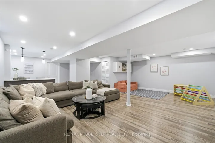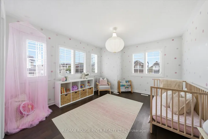 +"PublicRemarks": "Welcome to 1954 Riverton Street, a beautiful corner lot home built by Greycrest Homes and ideally situated in one of North Oshawa's best pockets. With over 3000 total sq ft, this property stands out with its elegant curb appeal, sun-filled interiors, and modern upgrades throughout.Step inside to discover an open-concept layout featuring soaring 18 ft cathedral ceilings that create a striking first impression. Hardwood floors flow seamlessly throughout the home, while 9 ft ceilings on the main level enhances the airy, spacious feel. The abundance of windows along the north side floods every room with natural light, recently upgraded with California shutters, creating a warm and inviting atmosphere. The main floor offers a perfect balance of function and style - featuring a large formal dining room ideal for family gatherings and special occasions. Complete with a cozy gas fireplace in the living room and open sightlines to the modern kitchen, making it perfect for both family time and entertaining. From the kitchen, step out to your custom-built deck, complete with built-in furniture, a fire table, and ample storage in the large shed - the perfect outdoor retreat for relaxing or hosting gatherings. Upstairs, you'll find four generously sized bedrooms, including a luxurious primary suite with a 5-piece ensuite, featuring a corner soaking tub and separate shower.The professionally finished basement offers even more living space with a modern open-concept recreation room, a sleek dry bar, and a rough-in bath ready for your personal touch. Ideal for a home theatre, games room. Located just 2 minutes away from top-rated schools and parks. Conveniently situated close to shopping, and major highways, this home combines elegance, comfort, and convenience in one perfect package."