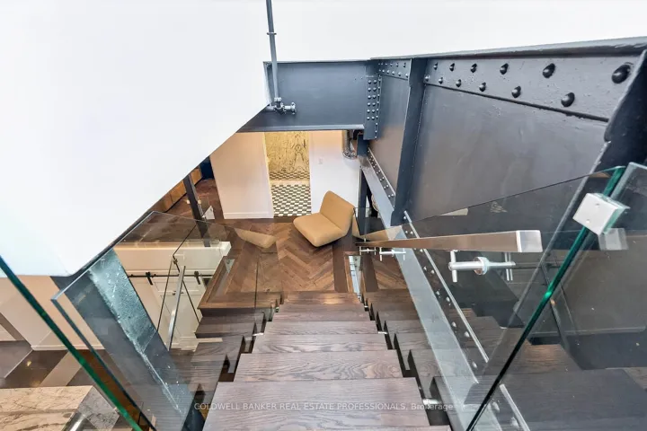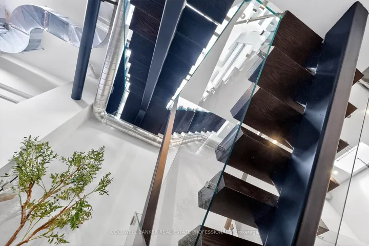 +"PublicRemarks": "An Architectural Hard Loft Masterpiece. Welcome to The 13 Skylight Loft! A truly spectacular multi-level industrial conversion unlike anything else in Leslieville. This rare residence features soaring 15 and 18 ft ceilings with 13 skylights, including remote operated skylights, flooding the space with natural light and highlighting diamond polished concrete floors and an impressive 18-foot exposed brick feature wall. A dramatic custom floating staircase with solid oak treads and glass railings leads to a striking mezzanine primary retreat overlooking the living space below, creating incredible vertical volume rarely found in Toronto lofts! Complete with herringbone hardwood floors, custom built-ins, and span inspired baths with Kohler fixtures, glass walk-in showers, and a luxurious soaking tub. At the heart of the home, a designer kitchen showcases Italian marble countertops, custom cabinetry and premium appliances including Wolf, Sub-Zero, Miele and a wine fridge anchored by a stunning oversized island. Step outside to your private rooftop terrace with breathtaking Toronto skyline views...the ultimate urban retreat. Additional features include Control4 smart home technology, solid steel mezzanine construction, individual rooftop HVAC, private hot water tank, upgraded designer lighting, double entry, and in-suite laundry. Located in the heart of Leslieville & Riverdale, one of Toronto's most vibrant creative communities. Steps to acclaimed restaurants, cafés, galleries, fitness studios, transit and the future Ontario Line, with quick access to the Gardiner, Lake Shore Blvd, and the DVP. 1 Parking spot included. Extra parking available nearby for rent."