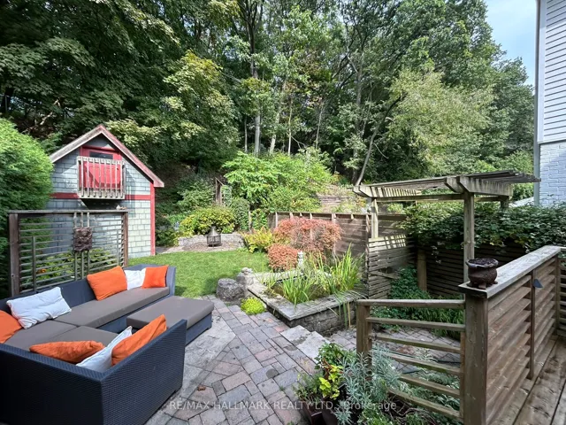 +"PublicRemarks": "Set on a rare wide lot and backing directly onto a peaceful ravine, this 1950s-built semi offers space, character, and a setting that's hard to come by. Thoughtfully laid out with generously sized principal rooms, the main floor features a large living room anchored by a double-sided fireplace that seamlessly connects to the dining area. From here, step out to a truly special backyard. A private, ravine-backed retreat complete with a deck for dining and BBQs, lush green space, a sitting area and a tranquil pond with water feature. A custom shed with a finished loft adds a playful bonus space that feels like a tucked-away treehouse. Upstairs, you'll find three well-proportioned bedrooms, each with its own closet, and an updated bathroom with a tub. The fully finished lower level offers incredible versatility with a walk-out, full bathroom, laundry room, and ample storage, ideal for a family room, home office, or guest space. Located nearby a quiet cul-de-sac where neighbours know each other and kids play freely, this is a true community pocket. Enjoy annual street gatherings, nearby ice skating at Love Crescent, and easy access to the Danforth GO, TTC, and top-rated schools including Malvern. Parking for two cars and an electric car charger outlet."