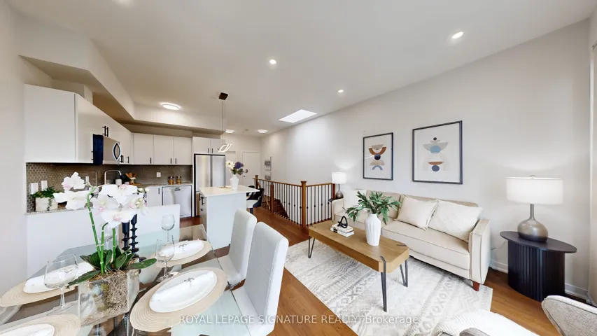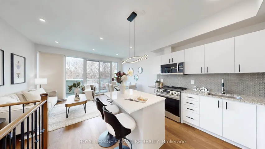 +"PublicRemarks": "Welcome to this stunning, fully upgraded modern 3-bedroom, 2-washroom townhouse in the award-winning Printing Factory Lofts & Towns, ideally located at Carlaw and Queen in the heart of South Riverdale.This beautifully appointed home features 9-foot ceilings, newly upgraded engineered hardwood flooring throughout, an upgraded kitchen with stone countertops, a new island with added storage and breakfast seating, stainless steel appliances includes double door fridge, a brand new kitchen faucet, upgraded lighting, hardwood stairs, and modern railings. The third bedroom features a mirrored closet door, and all closets include organizers. Large floor-to-ceiling windows in most bedrooms bring in abundant natural light. Enjoy a walk-out balcony with custom motorized blinds from one bedroom, as well as a walk-out terrace from the living and dining area with a gas line for BBQ.Owned HVAC upgrades were completed in 2023, including tankless water heater, A/C, and heating.Freshly painted and move-in ready. Maintenance fee includes water, common area maintenance & gardening, snow removal & building security & party room booking. Plus the package delivery & storage in locker for pick up.Steps to shops, restaurants, cafés, parks, recreation centre, fitness studios, grocery stores,streetcars, and two new Ontario Line stations. Walk Score 99/100. Close to Morse Street Jr.P.S. (French Immersion), Riverdale C.I., and popular daycares. An amazing opportunity in one of Toronto's hottest neighbourhoods."