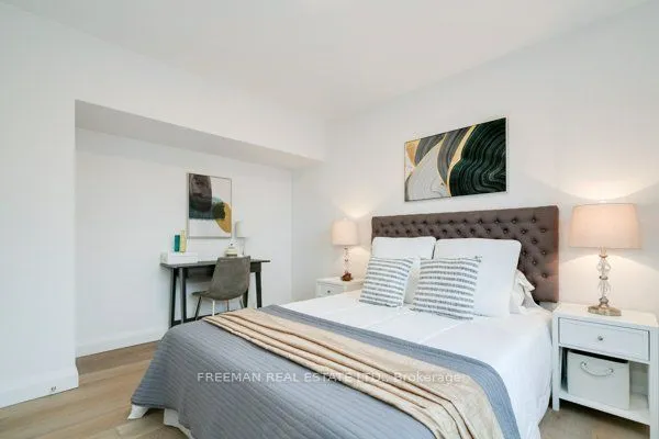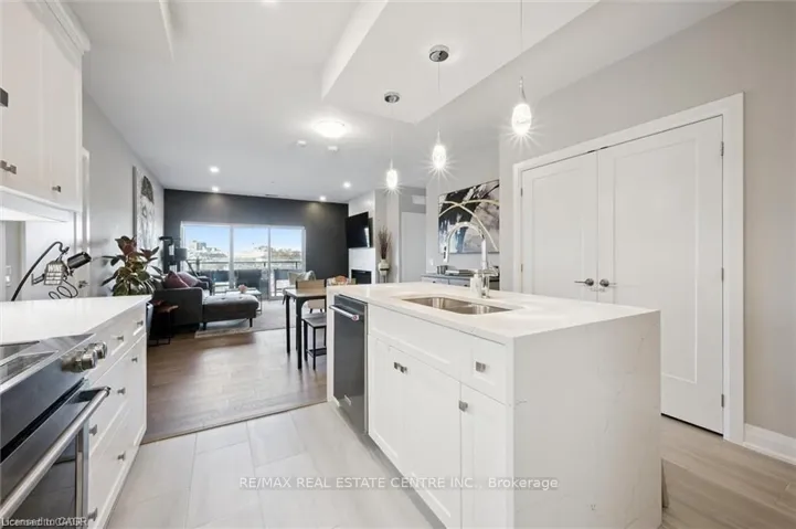 +"PublicRemarks": "Experience refined condo living at Edgewater Condominium, ideally located along the Eramosa River in the heart of Downtown Guelph. Unit 608 is a well-appointed 2-bedroom, 2-bath suite offering two private balconies and a functional open-concept layout with approx. 1260 square feet of living space. Engineered hardwood flooring extends throughout the living areas and bedrooms. The kitchen features a waterfall island, stone countertops, modern backsplash, and premium appliances, opening to the living and dining areas highlighted by a floor-to-ceiling tiled fireplace and walk-out to a balcony with city views. The primary bedroom includes a walk-in closet, private balcony, and a 5-piece ensuite with freestanding tub, glass shower, and heated floors. A second bedroom, 3-piece bath, and in-suite laundry complete the suite. Large windows provide abundant natural light and neutral finishes throughout. Includes one underground parking space, one storage locker, and access to building amenities including a library, party and media rooms, fitness centre, and guest suites. Steps to downtown amenities, riverfront trails, and GO/VIA Rail access."