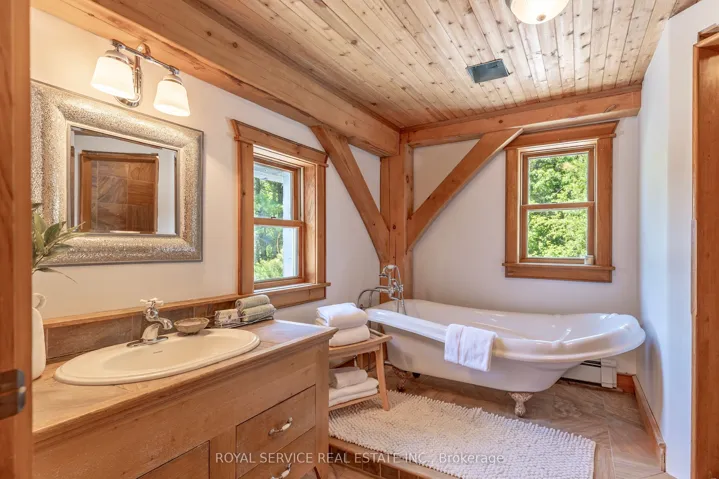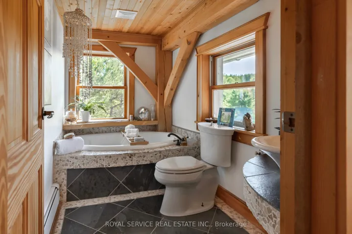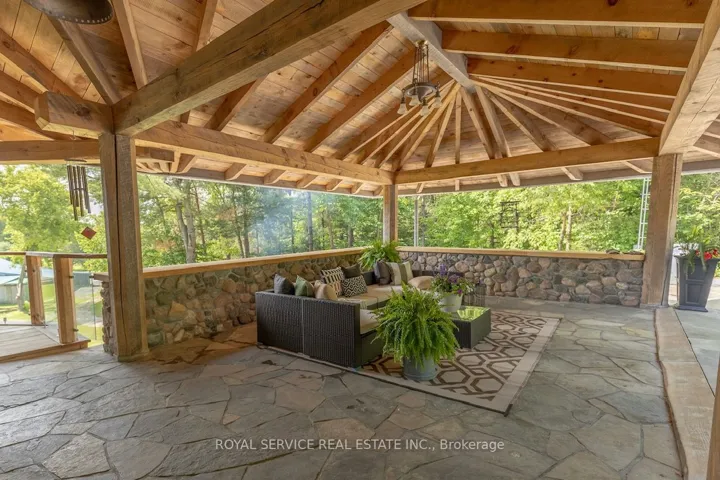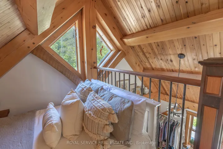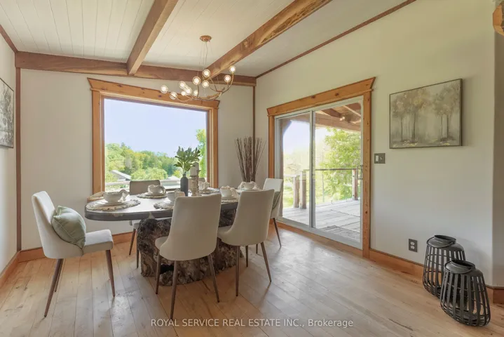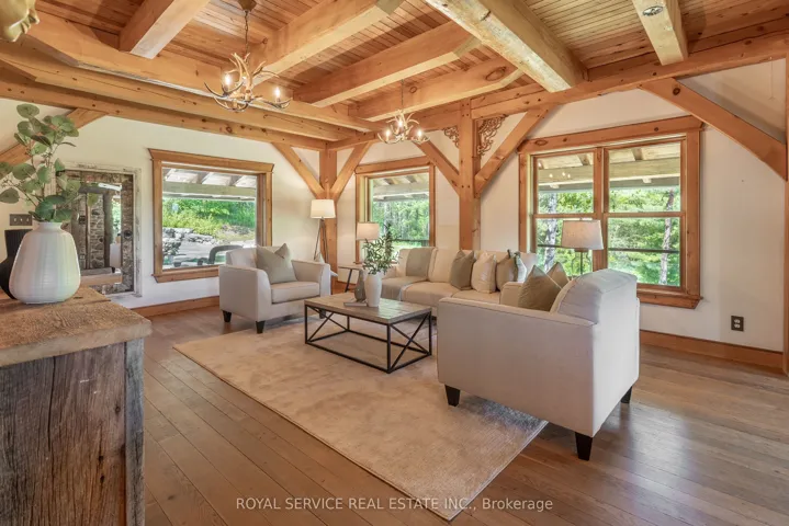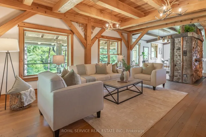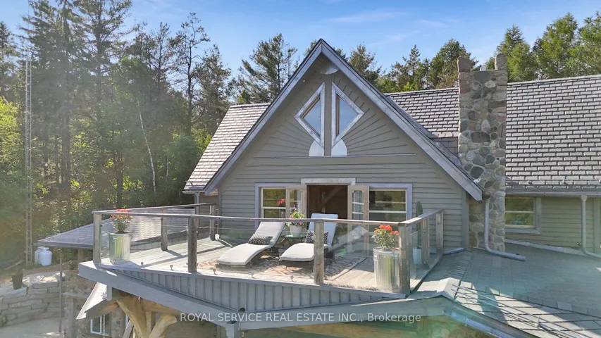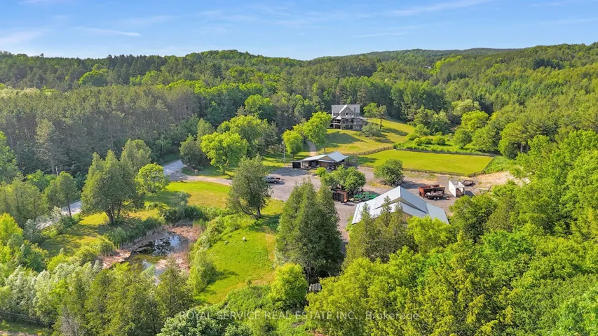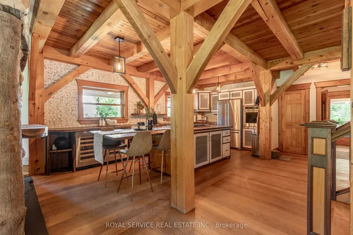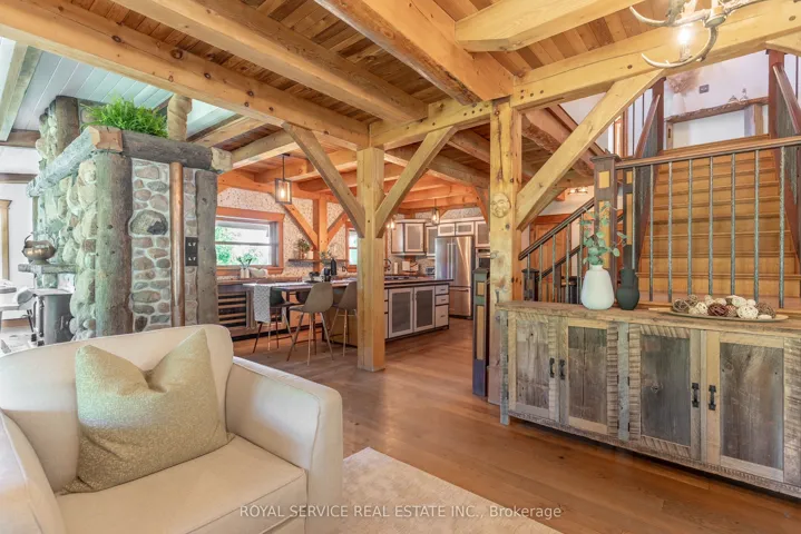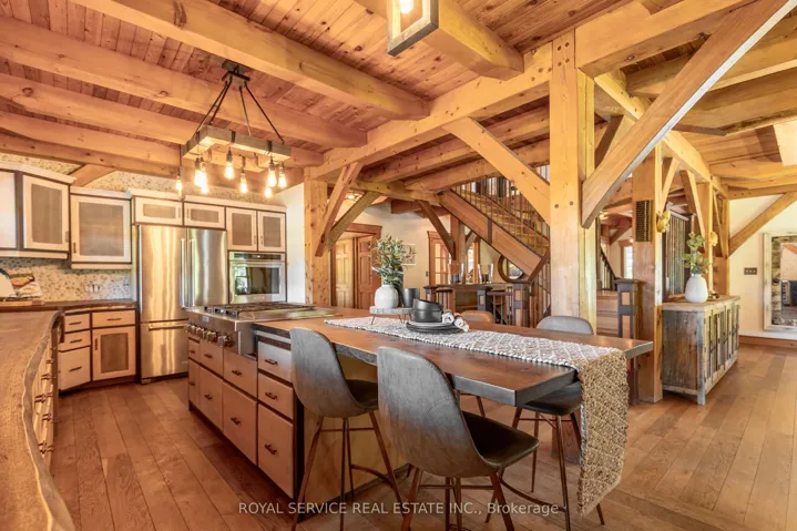 +"PublicRemarks": "Welcome to 8165 Carscadden Road, a timeless masterpiece on 40 Acres. Discover how this true architectural gem blends craftsmanship, creativity, and contemporary design into a private sanctuary.This one-of-a-kind home is perched on the side of a hill overlooking magnificent rolling treed countryside. Wrapped in the warm character of timber-frame construction, exposed beams, and soaring ceilings designed to impress with a culinary dream kitchen. Featuring all stainless-steel appliances, expansive prep & storage space. Perfect for home chefs and entertainers alike.The lower level is outfitted with in-floor heating throughout, adding comfort and luxury to everystep. Step outside and you're surrounded by professionally landscaped gardens, massive stone walkways and patios, an outdoor stone firepit,and the wraparound covered deck captures stunning views in every direction. A true highlight of the property is the 2,000 sq.ft. barn; currently used as a woodworking shop with full electrical service and two 12 ft wide drive-thru doors. At one time the paddock and second barn housed the owners horses.This home is more than just a retreat, it's an experience. Watch sunsets from the rooftop patio, take in panoramic views byday, and gaze at the star-filled skies by night.While the home feels worlds away, location is everything here..... a 5 minute country drive to Hwy 407 makes this a rare property that delivers true privacy without sacrificing convenience. 35 minutes to Yonge Street, less than 1-hour from the heart of Downtown Toronto makes for an easy stress-free commute. Library/office on main floor has Bell Fibe internet service could be 6th bedroom. The immediate area is surrounded by exceptional recreational amenities, including some of the best downhill skiing at Brimacombe Ski Hill. Walk to the 11,000-acre Ganaraska Forest offering year-round trails for horseback riding, cross-country skiing, hiking & more! Contact your agent for personal tour & aerial drone video link."