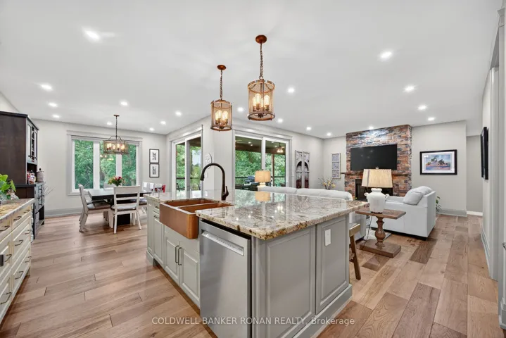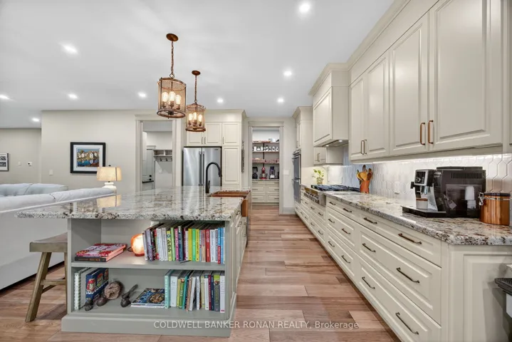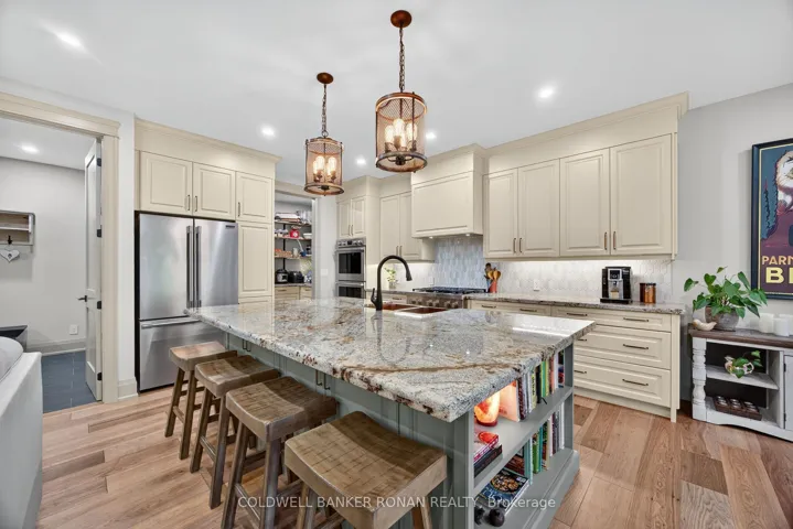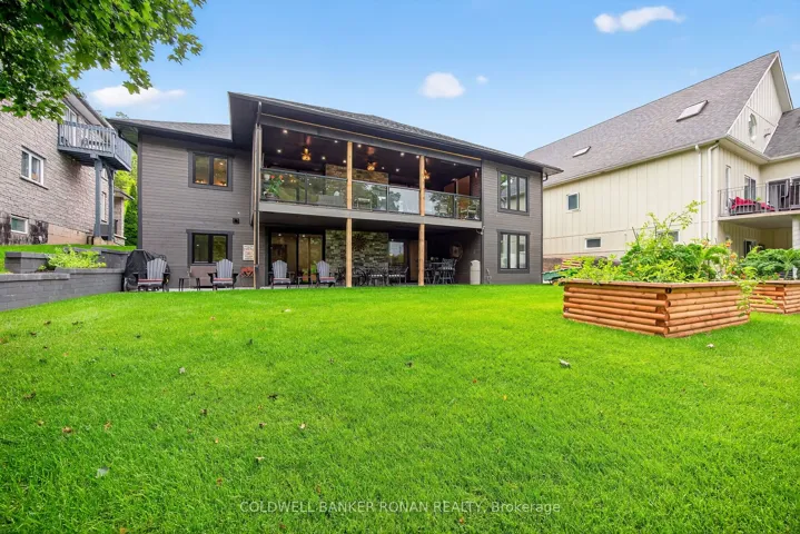 +"PublicRemarks": "Welcome to your dream home! This one year old custom built stunning property combines the convenience of in-town living with the serene ambiance of a cottage. Featuring over 4,000 square feet of finished living space and 9 foot ceilings with 3+ 2 bedrooms this home boasts an open concept design with designer-quality finishes throughout. The chefs kitchen is complete with a walk-in pantry and beverage fridge. Engineered hardwood floors run throughout the home, and multiple walkouts lead to a covered porch with glass railing, perfect for enjoying the scenic views of the river. The custom front door sets the tone for the rest of the home, which also features a rec room with a rough-in for a wet bar, in-floor heating in the basement, lower level walk-out to another covered patio, a massive cantina perfect for a wine room and a large garage. Professionally landscaped and truly turnkey, this home is ready for you to move in and enjoy! Walk to the quaint downtown and fabulous restaurants and nearby are parks, shopping, schools, golf and walking trails."