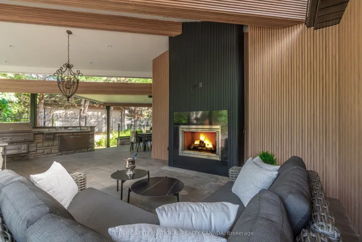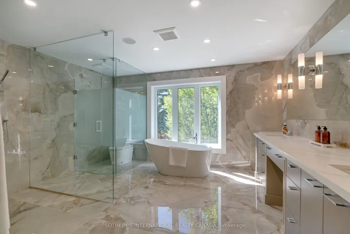 +"PublicRemarks": "Fully renovated, this 5+1-bedroom, 8-bathroom transitional estate backs onto holes 6 and 7 of the prestigious National Golf Course in Woodbridge. Set on a private 1+ acre lot with dual-gated entrances, intricate stonework, professional landscape lighting, mature trees, and striking black glass doors at both the entrance and garages, the property blends quiet elegance with secure living. Inside, refined craftsmanship is showcased through slab stone finishes, marble fireplaces, and a grand reception entrance with a 3-storey floating staircase. The residence offers: A primary suite with a Fendi Casa inspired walk-in closet and spa-like bath, ensuite baths and built-in closets in every upper-level bedroom; 3+1 kitchens and 2 laundry rooms for ultimate convenience; a wellness area with heated floors, change room, powder room and contemporary spa-shower plus direct pool access. Media and games rooms, sauna, home gym (or nanny's suite), and a dedicated space for a customized panic room. The resort-style backyard is designed for entertaining with an inground pool, covered loggia with outdoor kitchen and fireplace, dining and seating areas, and open, park-like grounds perfect for growing an organic vegetable garden or children's play. Parking for 15 vehicles includes a 3-car garage with lift-ready capacity. Move-in ready before Christmas, this estate combines contemporary luxury, privacy, and security - perfect for the discerning buyer. *Some pictures are virtually furnished."