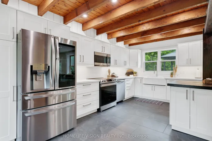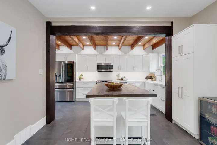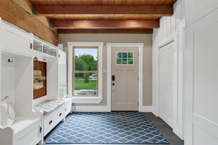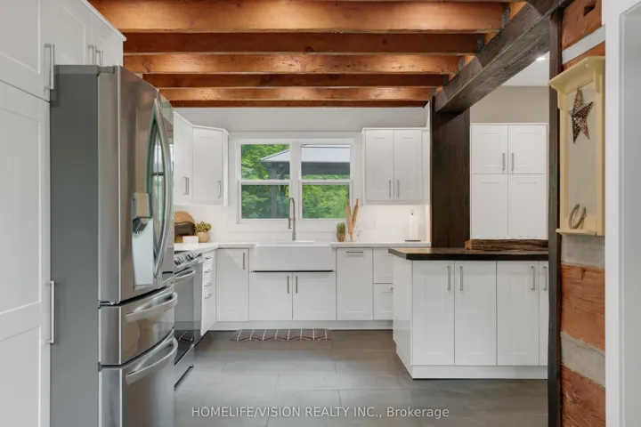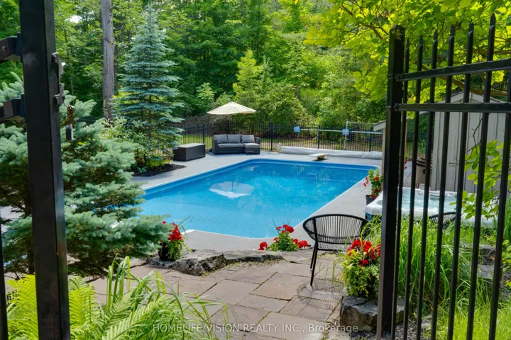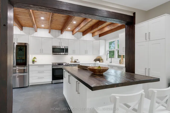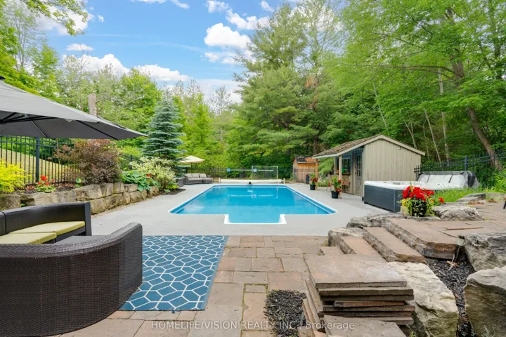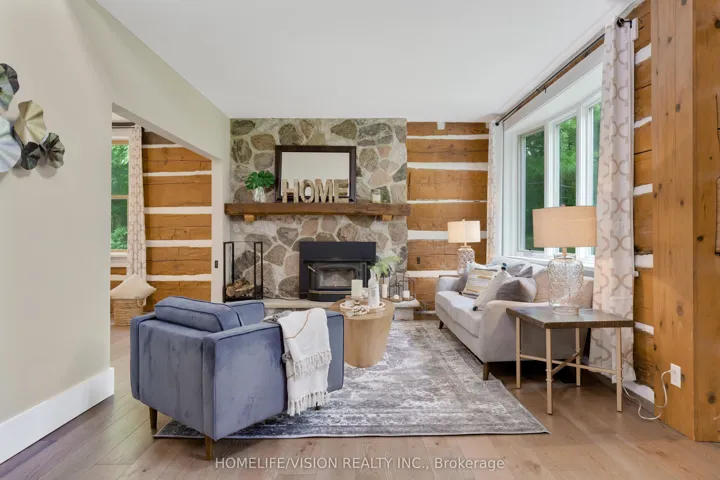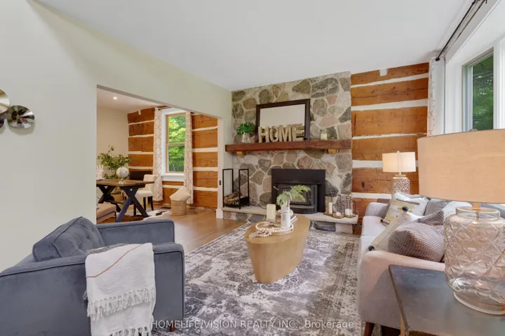 +"PublicRemarks": "Spectacular Hewn Log Home with 3+1 bedrooms and 4 bathrooms on 2.27 acres on coveted street! This serene, expertly landscaped property boasts a fully fenced lot surrounded by mature growth trees for the utmost privacy. Entertainers dream backyard oasis with in-ground saltwater pool, hot tub and multiples patios! Meticulously renovated with modern upgrades inside and out, no expense has been spared! Enjoy the spacious kitchen with quartz countertops and large reclaimed walnut island complimented by newer appliances, living room with soaring cathedral ceilings and stone wood burning fireplace, large office, dining room with beautiful backyard views and walkout to back deck, engineered hardwood throughout the main floor. The principal bedroom boasts a vaulted ceiling and ensuite with heated floors. Upstairs bedrooms have ample storage! Bright and cheery finished basement with walkout and gorgeous views of the backyard and pool, powder room, bedroom, and ample storage with luxury vinyl plank floor throughout. Exuding character with approx. 120 year old beams and brick feature wall. Spacious two car garage and large private laneway! Hardwired security cameras and industrial LED floodlights. Plenty of outdoor storage with two Mennonite built sheds with steel roofs and a coverall. Backup generator. Some windows and doors replaced in 2024. Amazing property to live at and play on! Don't miss it! Upgrades include: Metal roof and Pool Heater (2017), Upstairs Laminate Floor (2018), Composite Deck (2019), Front Walkway (2020), Kitchen and Landscaping (2021), Engineered Hardwood on Main Floor, Fencing, Basement Luxury Vinyl Plank, Pool Liner, Hot Tub (2022), Master ensuite and upstairs bathroom, Pool Surround, Laundry Room, Stair treads restained, spindles replaced and banister replaced (2023), Water Filtration System, Main Floor Bathroom (2024), Washer (2025), Dryer (2025)."