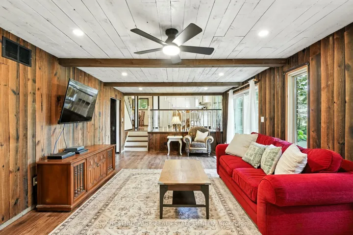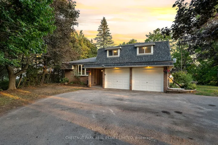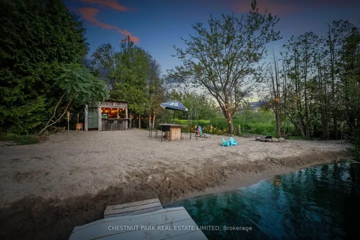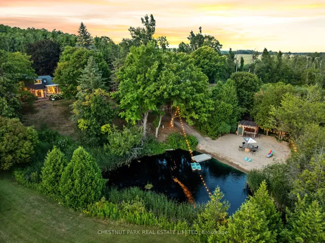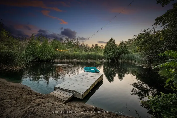 +"PublicRemarks": "Spectacular 1 acre property with picturesque pond views, private beach, and your own tiki bar, with hydro! Spacious, and well laid-out 2250 square foot side-split home offers 2 expansive living spaces, 4 bedrooms, a finished basement with shop, large attached 2 car-garage with interior access, and sunroom for enjoying the view. Laminate flooring runs throughout with new (2025) carpet in primary and second bedroom. Lower family room with charming beamed ceilings and stone fireplace offers a walk-out to patio where you can enjoy summer time barbecues. Circular drive offers lots of parking with additional space in 2 car garage for all of your toys! A true rustic retreat with beautiful sunset views, privacy, unmatched backyard entertainment and room to grow for a lifetime. Roof 2025. Central vac. Furnace approx 2018. Depth of well 17.4 metres as per well record attached. *Septic inspection, pump out receipt and floorplans attached*"