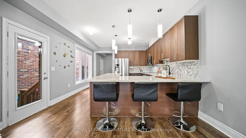 +"PublicRemarks": "Welcome to this beautifully renovated 4-bedroom townhome, nestled in a quiet & family-friendly neighbourhood. Just steps from your doorstep, enjoy a picturesque private pond & scenic walking paths the perfect blend of nature & convenience. This property is ideal for first-time buyers, investors, and growing families alike .Step inside to discover modern updates throughout, including: New main-level flooring, renovated powder room and primary ensuite, new patio door with built-in blinds, renovated basement, epoxy-coated garage floor, Elegant oak staircase with iron spindles. The spacious kitchen features quartz countertops, a modern backsplash, stainless steel appliances, ample cabinetry, and a breakfast bar area ideal for everyday living and entertaining. The open-concept basement offers a versatile retreat with a built-in bar area, perfect for relaxing or hosting. Outside, enjoy one of the bigger backyards in the neighbourhood, complete with a large deck, hard top gazebo, and a private courtyard ideal for gatherings, outdoor cooking, or simply unwinding. This stunning home perfectly combines style, comfort, and functionality truly a must-see!"