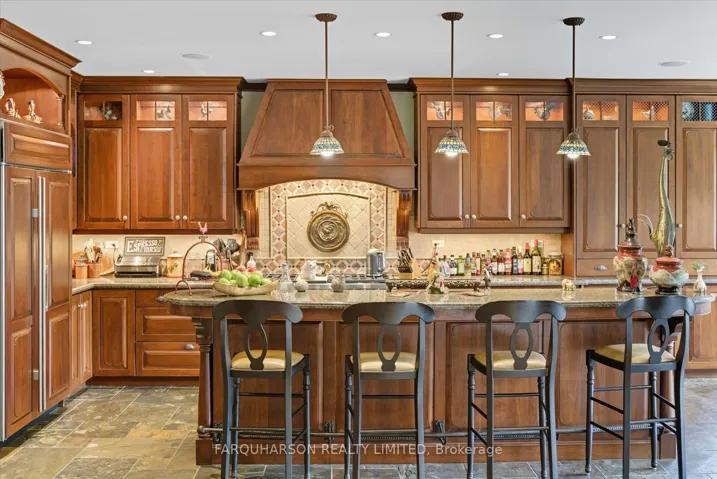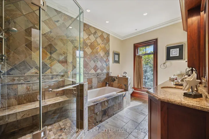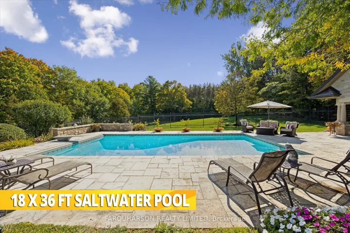 +"PublicRemarks": "Welcome to 7300 Concession 2, Uxbridge - an extraordinary private estate nestled on 92.15 acres of pristine forest, complete with a pond, stream, meadows and kilometers of private nature trails. A gated entrance framed by handcrafted Owen Sound stone pillars and wrought-iron gates leads to a winding drive and a secluded hilltop estate. Designed by an architect and built by Bristol Homes, this residence showcases impeccable craftsmanship with Owen Sound stone, copper accents, Indiana limestone window sills, and a 50-year Enviroshake roof ($275K). Inside, the grand foyer features heated slate floors and custom lighting. The formal living room boasts a stunning stone fireplace and arched windows, while the elegant library offers custom bookcases and solid wood finishes. The chef's kitchen is both functional and beautiful, with granite counters, heated floors, a large breakfast bar, and camera monitors offering views of the gated entrance. The principal suite is a serene retreat with Brazilian mahogany floors, walk-out to the pool, and a luxurious ensuite. Two additional bedrooms share a well-appointed 5 pc.ensuite. The lower level is ideal for entertaining, featuring a theatre zone, games room, gym, sauna, and a state-of-the-art mechanical room. Outdoors, enjoy a heated saltwater pool, stone patio, and matching cabana with sauna and 100-amp service. The beautifully renovated separate 800 sq ft guest house includes two bedrooms and Loewen windows. A 1,500 sq ft four-bay garage offers 11-ft ceilings, radiant heating, and built-in sound. This rare offering combines total privacy with convenient access to Uxbridge, Aurora, GO Transit, Hwy 407/404, and is just 50 minutes to Pearson Airport. 7300 Concession 2 is not just a home-it's a Timeless Estate where Luxury and Nature Live in Harmony."