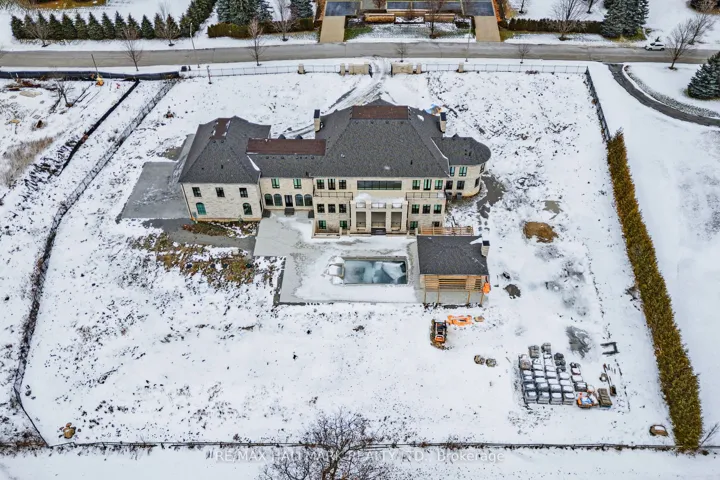 +"PublicRemarks": "Approx. 18,000 Sq Ft Of Custom Architectural Estate Living In Prestigious Fairfield Estates, King Township. This exceptional residence showcases grand scale, refined craftsmanship, and thoughtfully designed spaces throughout. A dramatic two-storey foyer opens to elegant principal rooms, including a formal sitting room, dining room, and a breathtaking great room with approx. 25.5-ft ceilings and floor-to-ceiling windows with electric blinds on both levels. The chef's kitchen is complemented by a fully equipped service kitchen and overlooks the backyard, pool, and cabana. The main level offers a private bedroom suite, conservatory/office wing, spacious mudroom, pet wash station, elevator, and main-floor laundry. A 4-car garage inc EV charging, multiple openers, and direct interior access. The upper level features multiple bedroom suites, elevator access, an open gallery overlooking the great room, a library with private balcony, additional laundry, and sitting area with walkouts to balcony. The primary retreat occupies its own wing and includes a boutique-style dressing room with centre island, spa-inspired ensuite with steam shower and soaker tub, and a walkout to the balcony spanning the rear of the home with views of the pool and countryside. The lower level includes a large rec rm with walkout, a music rm, extensive storage, a full kitchen, bedroom suite, movie theatre and a wellness area w/sauna & steam rm. Finished with quartz countertops throughout, hardwood & porcelain flooring, 8-ft doors, multi-zone HVAC, security system, and cameras. Private well and septic. A rare opportunity to own a thoughtfully designed estate offering luxury, comfort, and modern infrastructure!"