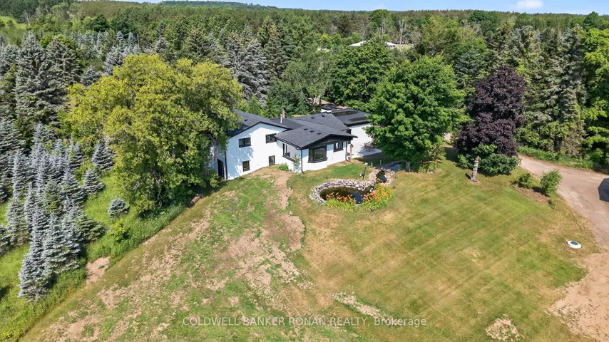 +"PublicRemarks": "Located just above Highway 9, minutes from Hwy 9 and Airport Road this 25 acre retreat like setting features rolling treed landscapes, ponds and a 3 bedrooms, 4 bathrooms 4 level side split taken back to the studs and fully remodelled. This designer finished home offers bright and spacious living, multiple walkouts, stunning finishings and fixtures all brand new and never lived in! Upper level with 2 bedrooms with ensuites. Main level features an open concept living room and kitchen with breakfast bar and sunken eating area, mud room, laundry and half bath. Walkout lower level with wood burning fireplace, 3rd bedroom and four-piece bath. From the private tree lined drive to the koi pond overlooking the spring feed pond and enchanting panoramic views of mostly blue spruce creates picturesque scenery all year round. The 25 ft x 45 ft barn could be used for animals, storage for recreational vehicles or both."