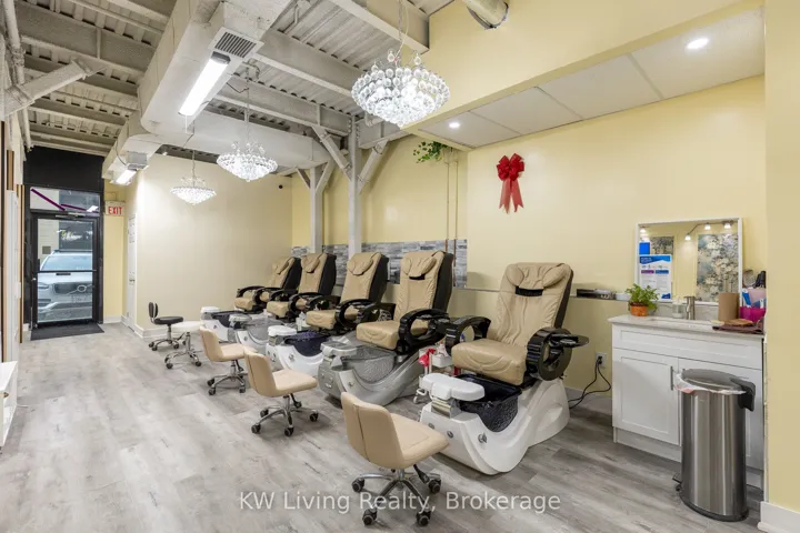 +"PublicRemarks": "Turn-key nail salon with good exposure of storefront and pylon signage fronting Jane St. Located in a busy plaza with ample parking, close to public transit and minutes to Hwy 400. Practical layout includes 1 storage room, 1 washroom, and 1 private treatment room suitable for waxing, lashes, or head spa, along with in-unit laundry. Equipped with 5 massage pedicure chairs and 4 manicure tables (with potential to expand to 6). Established local presence with positive Google reviews and repeat clientele. Affordable rent with a long-term lease in place."