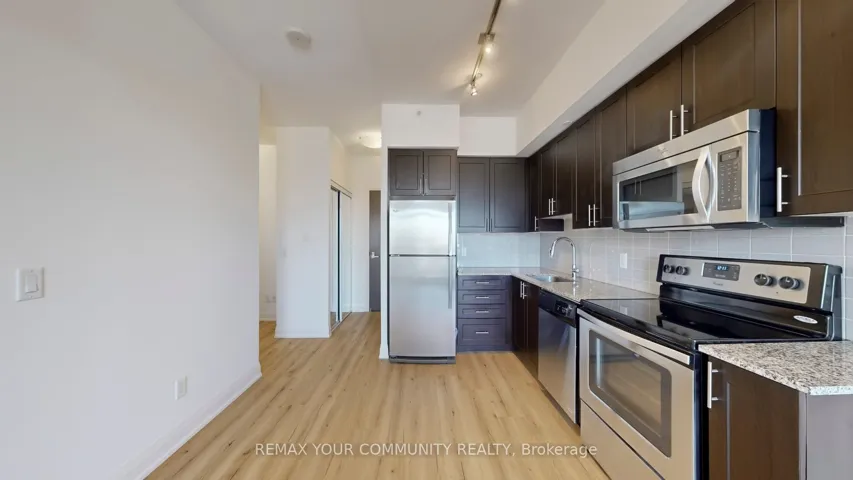 +"PublicRemarks": "Beautifully renovated, nearly 600 sq ft 1 Bedroom + Den suite at The Fountain Condos, featuring 9-ft ceilings and a private balcony. This bright, move-in ready unit includes new premium vinyl flooring, fresh paint, and a spotless interior throughout. The modern kitchen is equipped with granite countertops, stainless steel appliances, and a ceramic backsplash, while the spacious primary bedroom offers a walk-in closet. Includes parking and locker. Ideally located just steps to Walmart, Promenade Mall, restaurants, schools, parks, and public transit, with easy access to Highways 7 & 407."