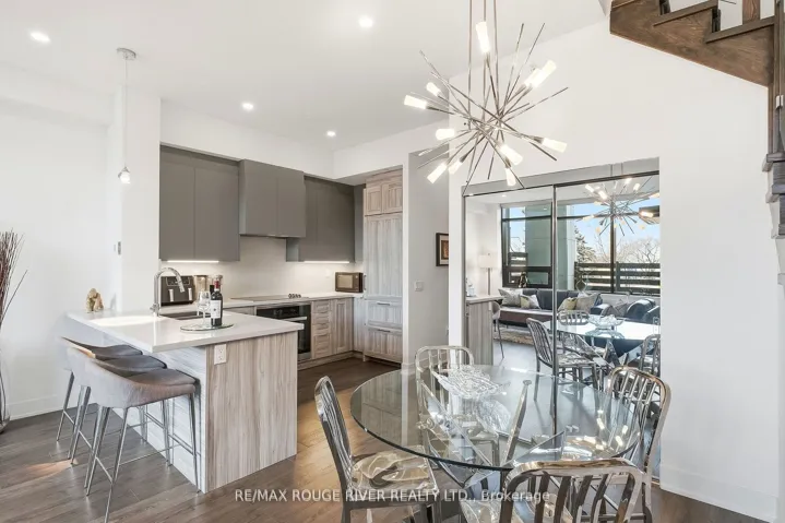 +"PublicRemarks": "A rare private-entry lux town at the prestigious NORD East Condos, where the refined design reflects an elevated urban lifestyle. Known for its exceptional amenities and well-regarded Del Property Management, the bright, open interior features soaring ceilings, expansive windows, and a seamless walkout to a private terrace, ideal for dining alfresco, complete with a BBQ gas line, waterline, and your own private exterior entry gate, perfect for an active, pet-friendly lifestyle. The integrated chef's kitchen showcases Caesarstone counters and premium Miele appliances, blending style with everyday functionality. A spacious main-floor den with mirrored closets offers versatility as an office or a guest room, conveniently located near the powder room. The elegant glass staircase leads to a generous primary retreat featuring a large walk-in closet and a well appointed ensuite with extended double vanities. Custom blinds, pot lights, chandeliers, and curated finishes enhance the home throughout. Residents enjoy resort-style amenities including an aqua oasis with indoor/outdoor pools, yoga studio, fitness centre, 24-hour concierge, guest suites, theatre room, party room, chef's table, and pet spa. Access to a new park featuring a children's play area adds to the community"s appeal. Includes a storage locker and a dedicated underground parking space, plus ample ground level visitor parking. With a 10 min. walk to the VMC (subway, TTC line 1), & the Smart VMC bus terminal, & Viva transit, the power of proximity offers seamless connectivity to the city."