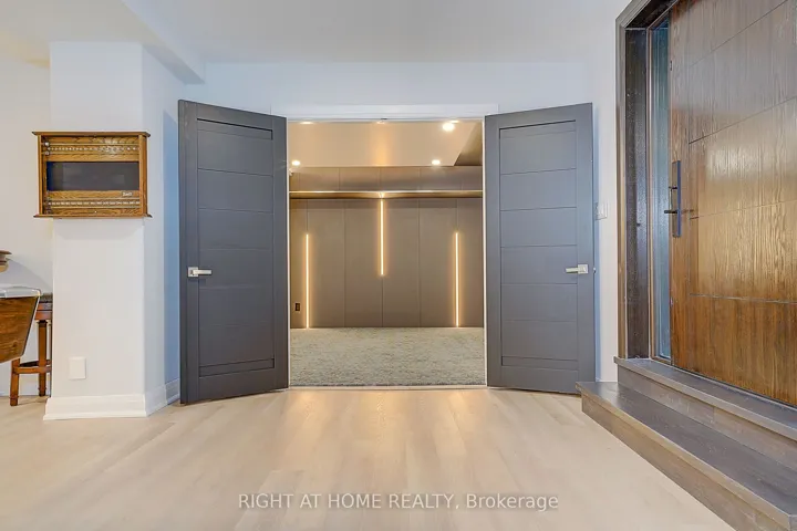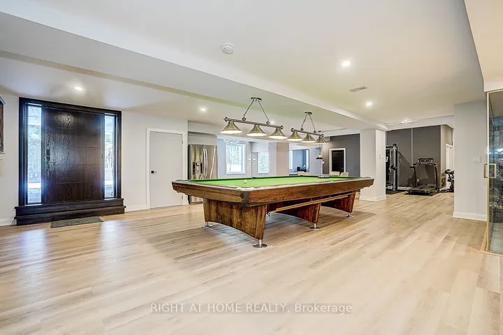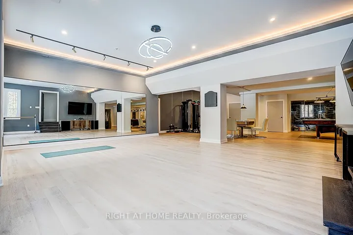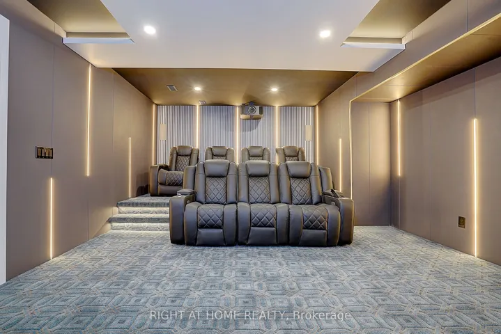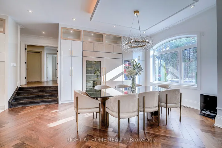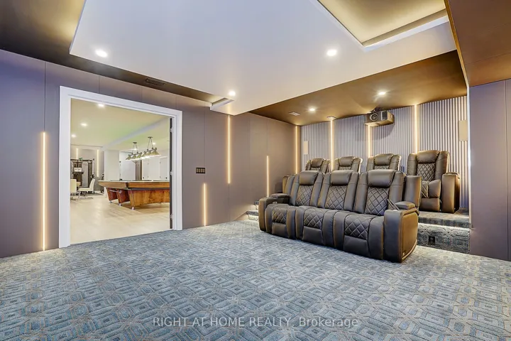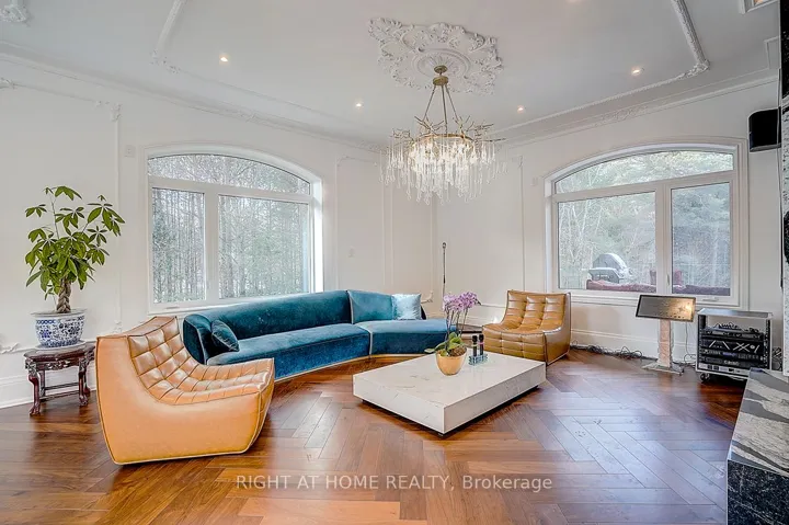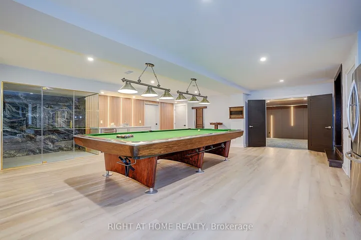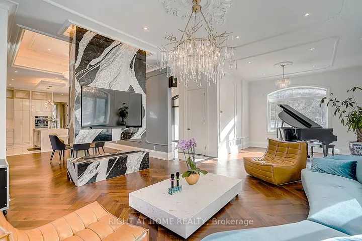 +"PublicRemarks": "Rare Modern French Luxury Bungalow Estate. A rare offering in today's market, this exceptional Modern French-inspired luxury bungalow redefines high-end living by seamlessly combining estate-level luxury with unparalleled everyday convenience-all on one expansive level. Set on a 2-acre private lot backing onto an endless forest, the home welcomes you with a crescent-shaped driveway and refined architectural detailing. Inside 12' ceiling (Main), solid walnut chevron flooring, custom plaster wall trims, medallion ceilings, and a dramatic floating marble TV and fireplace wall reflect timeless Modern French craftsmanship. The gourmet kitchen is fully equipped with elite appliances, including a 72" see-through Sub-Zero refrigerator and freezer, Wolf gas cooktop, and Miele built-in coffee machine, steam oven, and dishwasher-designed to elevate daily living hile supporting effortless entertaining. The main-level primary suite offers a true spa retreat, featuring a luxury ensuite bathroom with wet sauna, premium fixtures, and smart toilets that enhance comfort and hygiene throughout. An elegant entryway with floating custom cabinetry provides discreet and functional storage. What truly sets this bungalow apart is its fully developed 3,000-square-foot lower level, thoughtfully designed for both lifestyle and recreation. It includes a professional dance studio (10'), gym, walk-in temperature-controlled wine cellar, traditional wood sauna, snooker area, private Home Theater, and an additional ensuite bedroom-ensuring space for every passion without sacrificing main-floor convenience. The three-car garage features a golf simulator room and an upper loft offering exceptional flexibility. Outdoor living is elevated with a super-sized concrete rooftop deck, creating a four-season retreat surrounded by nature. An extended concrete driveway into the backyard further enhances functionality and scale."