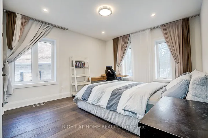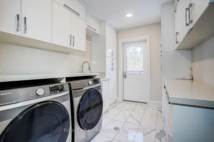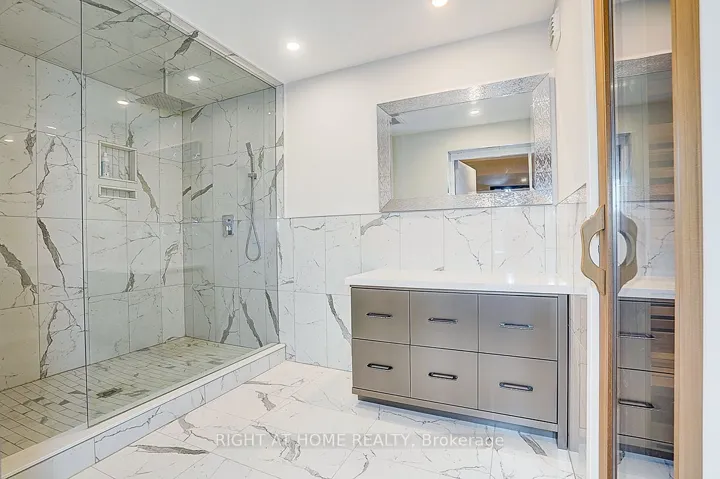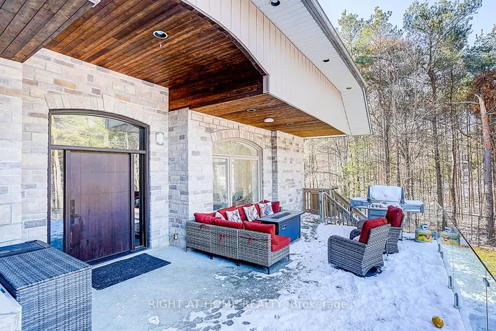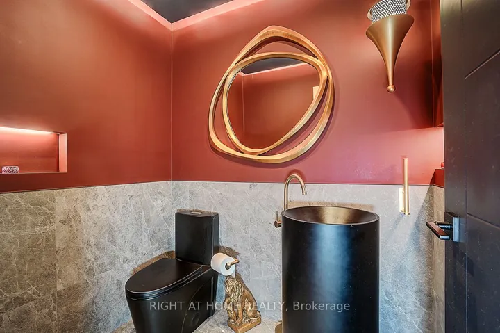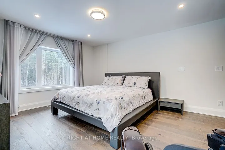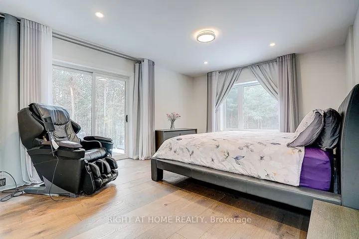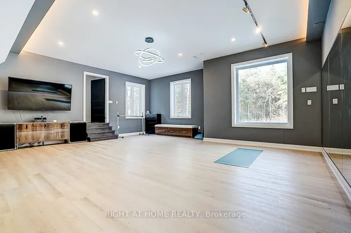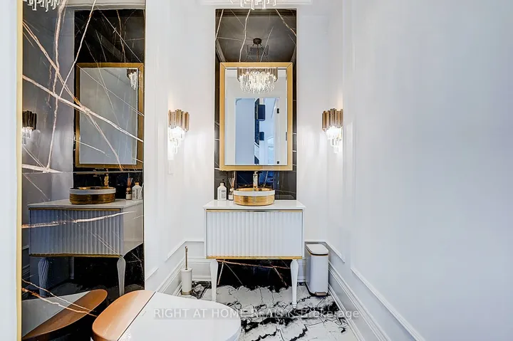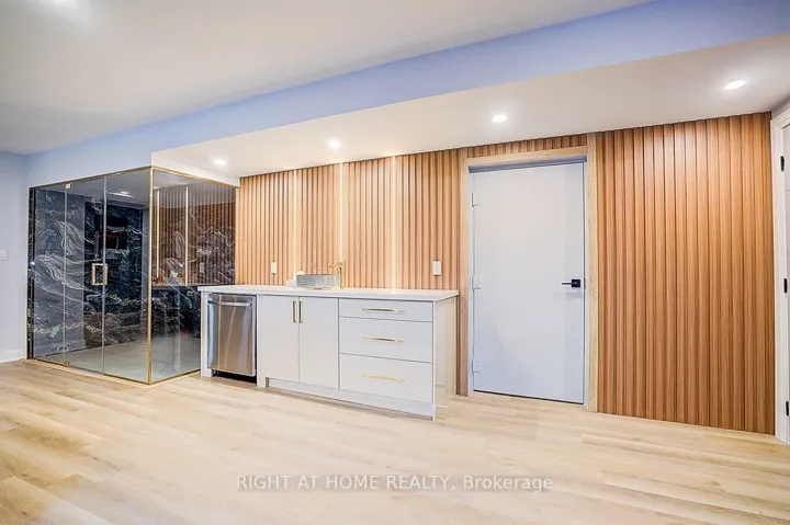 +"PublicRemarks": "Rare Modern French Luxury Bungalow Estate. A rare offering in today's market, this exceptional Modern French-inspired luxury bungalow redefines high-end living by seamlessly combining estate-level luxury with unparalleled everyday convenience-all on one expansive level. Set on a 2-acre private lot backing onto an endless forest, the home welcomes you with a crescent-shaped driveway and refined architectural detailing. Inside 12' ceiling (Main), solid walnut chevron flooring, custom plaster wall trims, medallion ceilings, and a dramatic floating marble TV and fireplace wall reflect timeless Modern French craftsmanship. The gourmet kitchen is fully equipped with elite appliances, including a 72" see-through Sub-Zero refrigerator and freezer, Wolf gas cooktop, and Miele built-in coffee machine, steam oven, and dishwasher-designed to elevate daily living hile supporting effortless entertaining. The main-level primary suite offers a true spa retreat, featuring a luxury ensuite bathroom with wet sauna, premium fixtures, and smart toilets that enhance comfort and hygiene throughout. An elegant entryway with floating custom cabinetry provides discreet and functional storage. What truly sets this bungalow apart is its fully developed 3,000-square-foot lower level, thoughtfully designed for both lifestyle and recreation. It includes a professional dance studio (10'), gym, walk-in temperature-controlled wine cellar, traditional wood sauna, snooker area, private Home Theater, and an additional ensuite bedroom-ensuring space for every passion without sacrificing main-floor convenience. The three-car garage features a golf simulator room and an upper loft offering exceptional flexibility. Outdoor living is elevated with a super-sized concrete rooftop deck, creating a four-season retreat surrounded by nature. An extended concrete driveway into the backyard further enhances functionality and scale."