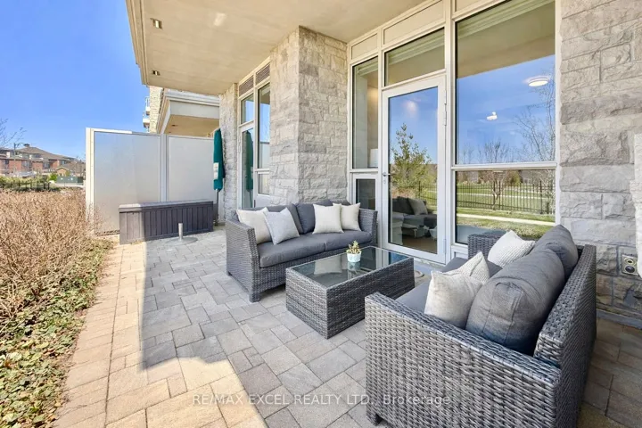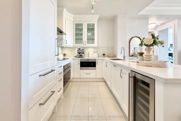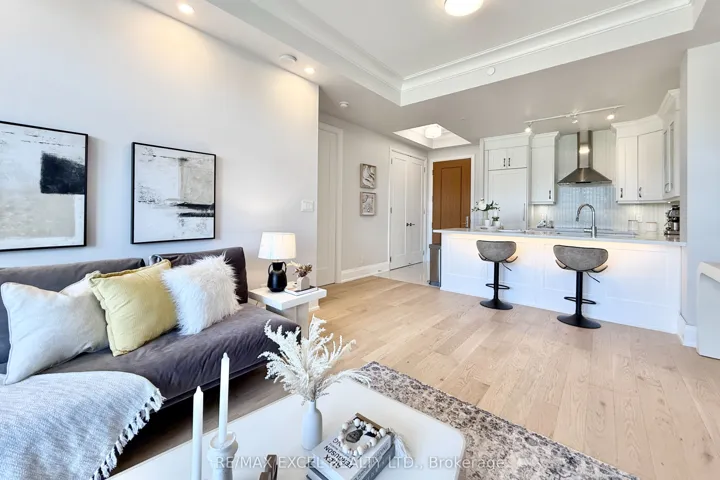 +"PublicRemarks": "This stunning ground-floor suite offers the rare convenience of bungalow-style living, complete with a walkout to a large, private, tree-lined patio with paved stone. Immaculately maintained and entirely carpet-free, the home showcases extensive modern upgrades and high-end finishes throughout, including soaring 10-foot ceilings, elegant cornice moulding, upgraded 8-foot doors, and 7 1/4-inch baseboards. Rich, engineered hardwood flooring flows seamlessly through the open-concept layout, leading into a beautifully upgraded kitchen with custom extended cabinetry, quartz countertops, a glass backsplash, and premium Sub-Zero and Wolf built-in appliances, including a wine cooler. The suite also features in-suite security and includes one EV parking space and a locker. Residents enjoy access to exceptional building amenities, such as 24/7 concierge service, a two-level lounge with a cozy fireplace and walkout to a large terrace, and five-star resort-style offerings including meticulously maintained grounds, an outdoor infinity pool, and a patio with BBQ area. Additional amenities include a spacious party lounge with bar, kitchen, and dining area, a games room, a fully equipped fitness centre with yoga room, whirlpool and sauna, a guest suite, and both above-ground and underground visitor parking. Conveniently located just minutes from Highway 404 and within the top-ranking Pierre Elliott Trudeau High School district."