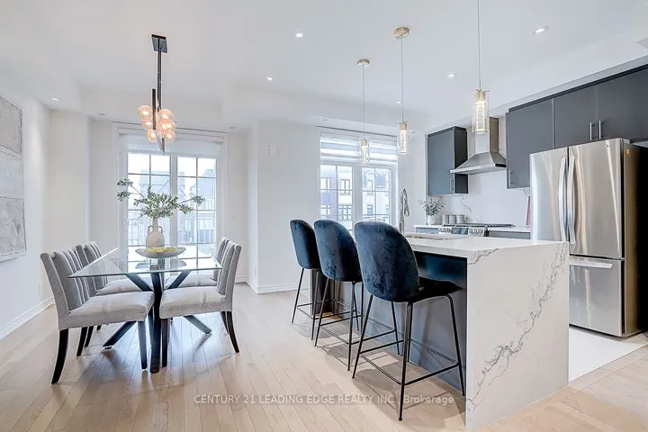 +"PublicRemarks": "Welcome to 32 William Shearn Crescent, a fully upgraded modern 3-storey residence offering a family friendly living in Angus Glen community This stone and brick townhouse offers no maintenance fees, and 100% freehold, with over $50k in upgrades. Inside, rich natural hardwood flooring carries throughout the upper levels, complemented by a designer staircase featuring custom iron pickets and solid hardwood treads. The second level reveals a bright, open-concept living space featuring: Smooth ceilings, pot lighting, and contemporary designer fixtures. The gourmet kitchen includes marble countertops, a striking marble backsplash, and an impressive waterfall island that anchors the space with both form and function. Premium upgraded stainless steel appliances, including a GE Café gas stove and matching hood, elevate the culinary experience, while automatic Electric Zebra Blinds provide effortless style and privacy. The third floor offers two bedrooms and two beautifully upgraded bathrooms. The primary suite, featuring his/her closets and a 3-piece ensuite. Crowning this remarkable home is a private rooftop terrace - an exceptional outdoor oasis perfect for sophisticated entertaining, tranquil mornings, or evenings under the stars. Additional highlights include an extended-length garage with ample room for parking and storage, as well as a built-in EV charger. Perfectly positioned near top-rated schools such as; Pierre Elliot Trudeau S.S., Buttonville P.S., Unionville College & Angus Glen Montessori."