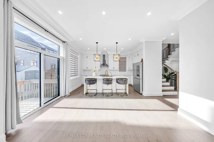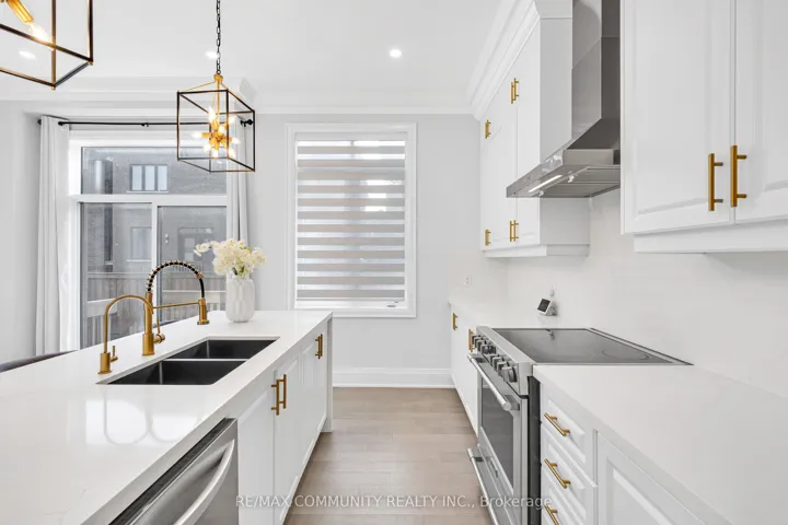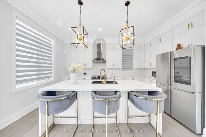 +"PublicRemarks": "Beautiful 4-bedroom, 3-bathroom home just steps from Highway 407 with convenient access to the Markham GO Station, top-rated schools, community centres, and public transit. Featuring 10-foot ceilings on the main floor, hardwood floors throughout, and bright, spacious rooms filled with natural light. The main level is enhanced with a stunning waterfall island, elegant crown moulding, and coffered ceilings, offering a perfect blend of style and functionality."